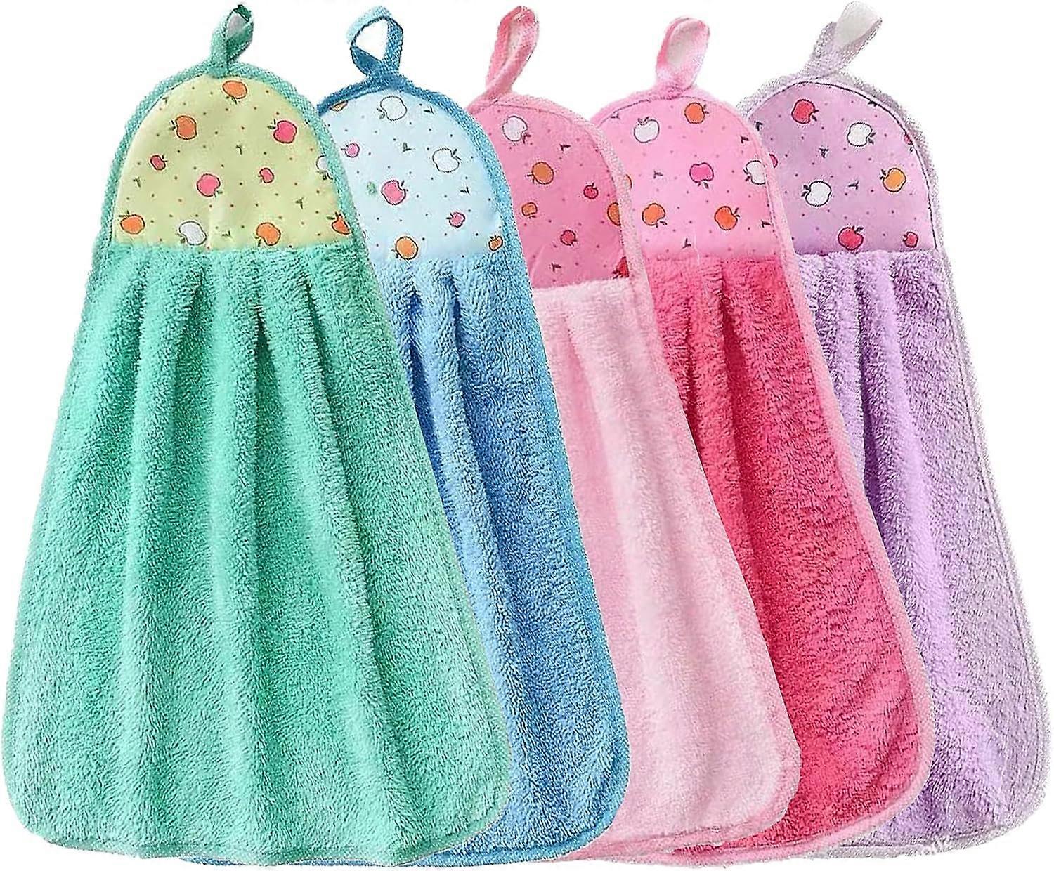Soft and skin-friendly coral fleece: Our towels are made of high-quality coral fleece, quick-drying and with good water absorption, without fading or lint.Easy care and quick drying: these towels can be fully machine washed and the drying speed is also very fast.Size: 30x38cm, 5 colors of purple, blue, pink, red and green, wipes of different colors make it easy to distinguish the use of each towel.Hanging rope design: Kitchen hanging loop hand towel. There is a hanging hole at the top of the towel, which can be hung anytime and anywhere, and can also be used as home decor.Versatile use: Our towels can be used for drying hands, washing dishes, washing cars, wiping table furniture, etc. Safe to touch and clean on body or glass.