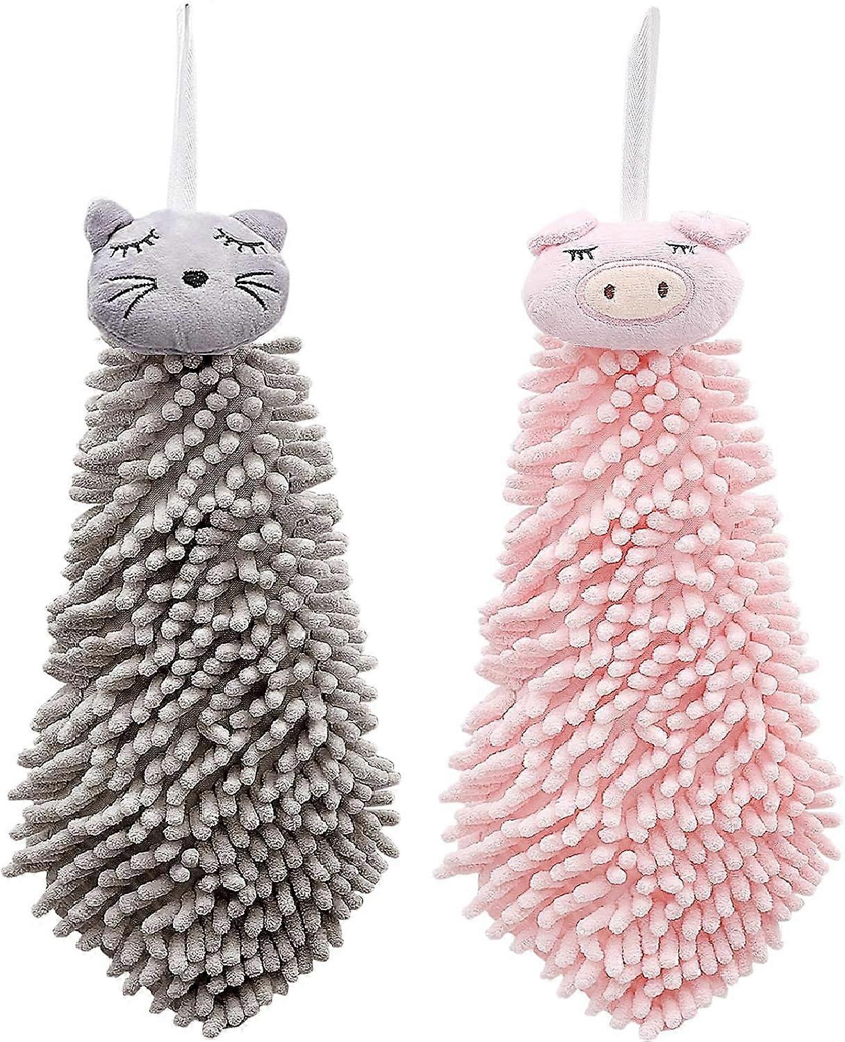 Soft and absorbent: These hand towels are made from high-quality materials; the plush is soft to the touch, thick, and absorbent, making it easy to dry your hands. They are easier to wash and dry than regular towels and are machine washable.Cute and modern: cute animal design, attractive appearance, children love them and encourage them to wash their hands themselves, hang these towels in the house, children will want to wash their hands more often, they are also perfect as towels for guests.Practical: place them above the sink to save on paper towels. No need to fold the towel; the hand towel has a hanging loop at the top and is ready to use as soon as it's hung. Space-saving, it's suitable for kitchens, bathrooms, bedrooms, living rooms, laundry rooms, etc.Creative Gift: These hand towels can also be a lovely little gift for someone, especially children. No one will love these pretty hand towels; they are an excellent gift choice for Christmas, birthdays, christenings...Size and quantity: 26*28cm, 2 bathroom hand towels (pink pig + grey kitten)