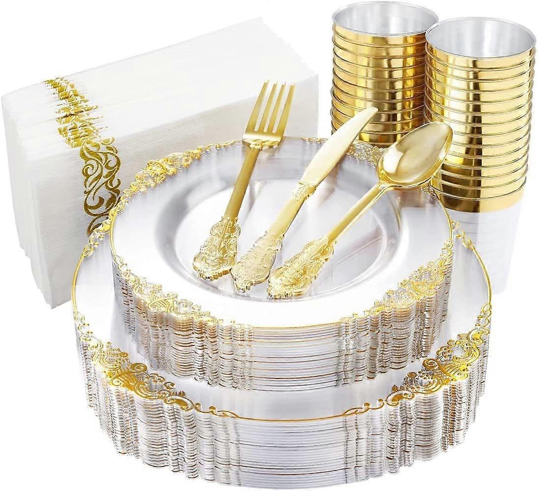 175Pcs Tableware Transparent Flower Petal Shape Gold Rim Plastic Plate Cup Silverware Birthday Wedding Party Supplies