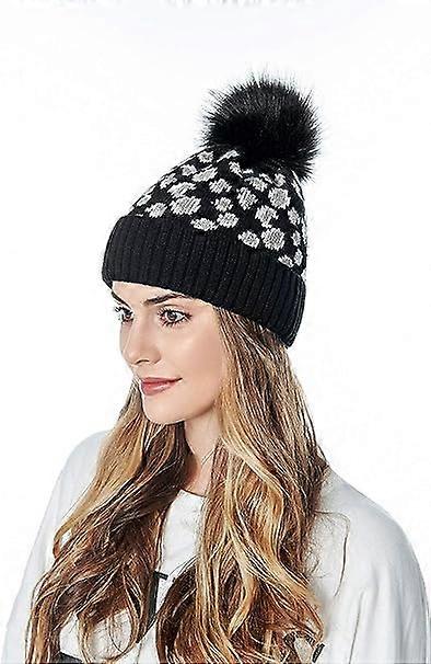 Dww-Black Women's Winter Knitted Beanie, Hats and Caps, Leopard Print Crochet Beanie, Ski Hat with Pom-pom