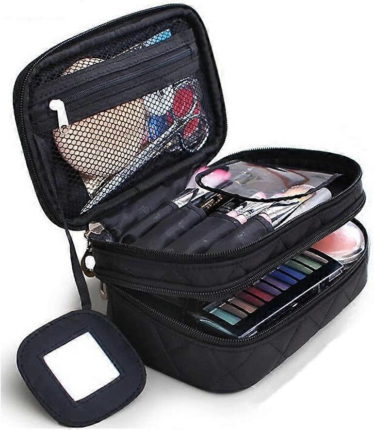 Dww- Black Makeup Bag, Cosmetic Bag 20 * 12 * 8 cm Double Layer with Mirror for Women