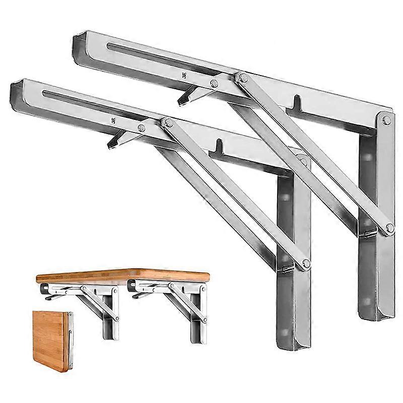 Folding Bracket can provide space saving solutions such as caravan, boat, motorhome, RV, apartment and small kitchens. It also provides a great solution for a lack of work surface in garage and workshop, you can create wall mounted folding workbench or fold down work table that can be folded away easily after using by its quick release. Specifications: Color: Silver Material: StainlessSteel Surface Treatment: Brushed Max. Load: Approx. 60kg / 132 lbs per Pair Hole Diameter: 5mm / 6.5mm Fold Size: 400x37x40mm / 15.7x1.45x1.6 inch (L*W*H) Open Size: 400x37x175mm / 15.7x1.45x7 inch (L*W*H) Package Content: 1 x Collapsible Bracket NOTE: It is recommended to install in Pairs. If the load is greater than 60kg or the bearing plate is deformed and bent, better to add a fixed bracket in the middle to improve the stability of the installation. Installation Method: 1. Measure the position size on the board 2. The shelf protrudes 1mm from the board when aligned 3. Mark the position size 4. Fix the triangle bracket on the board 5. Mark the corresponding position on the wall 6. Drilling hole 7. Plugged with nylon expansion tube 8. Fix the triangle bracket with screws