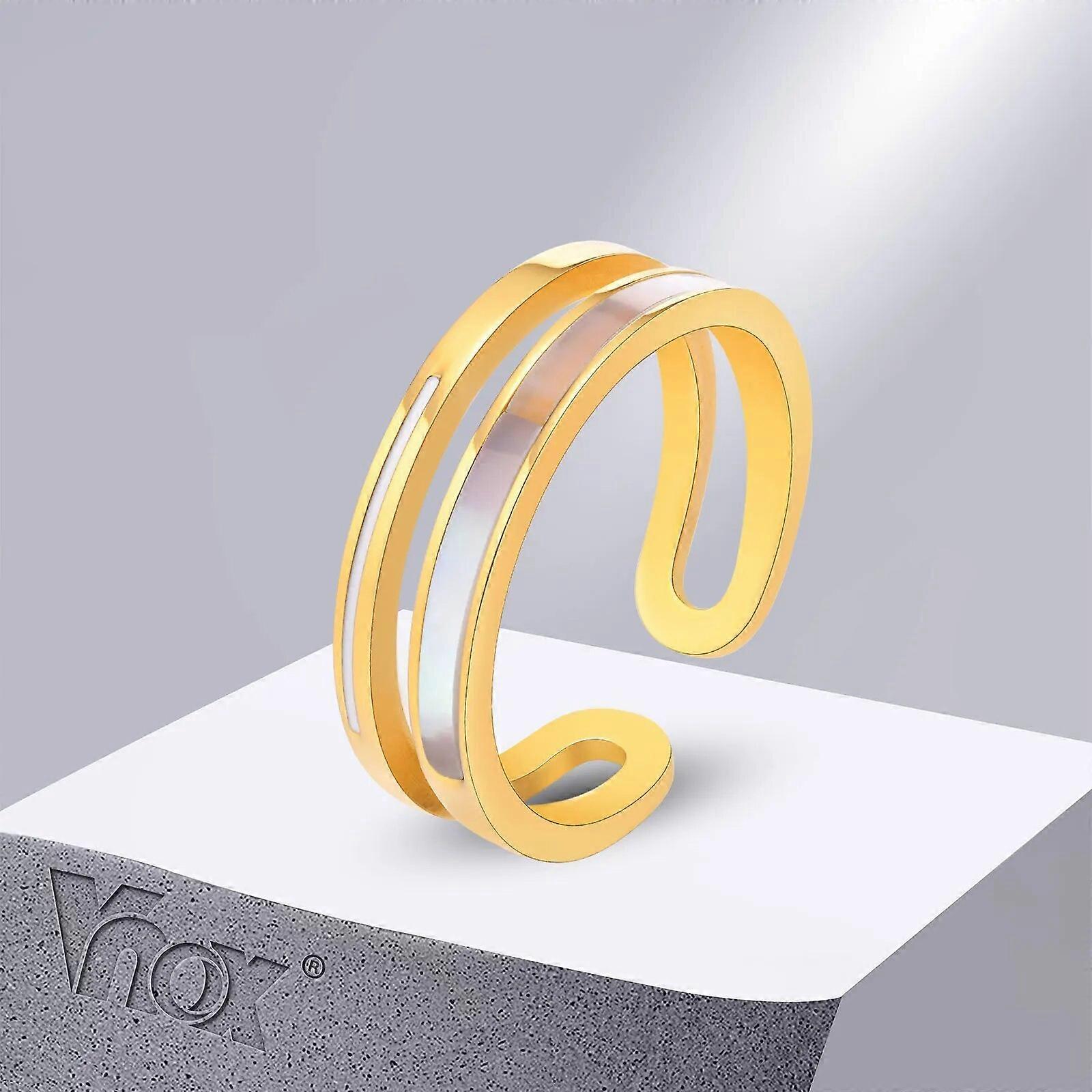 Chic Double Lines Rings for Women, Gold Color Stainless Steel Hollow Wedding Bands, Shell Inlay Finger Gift Jewelry
