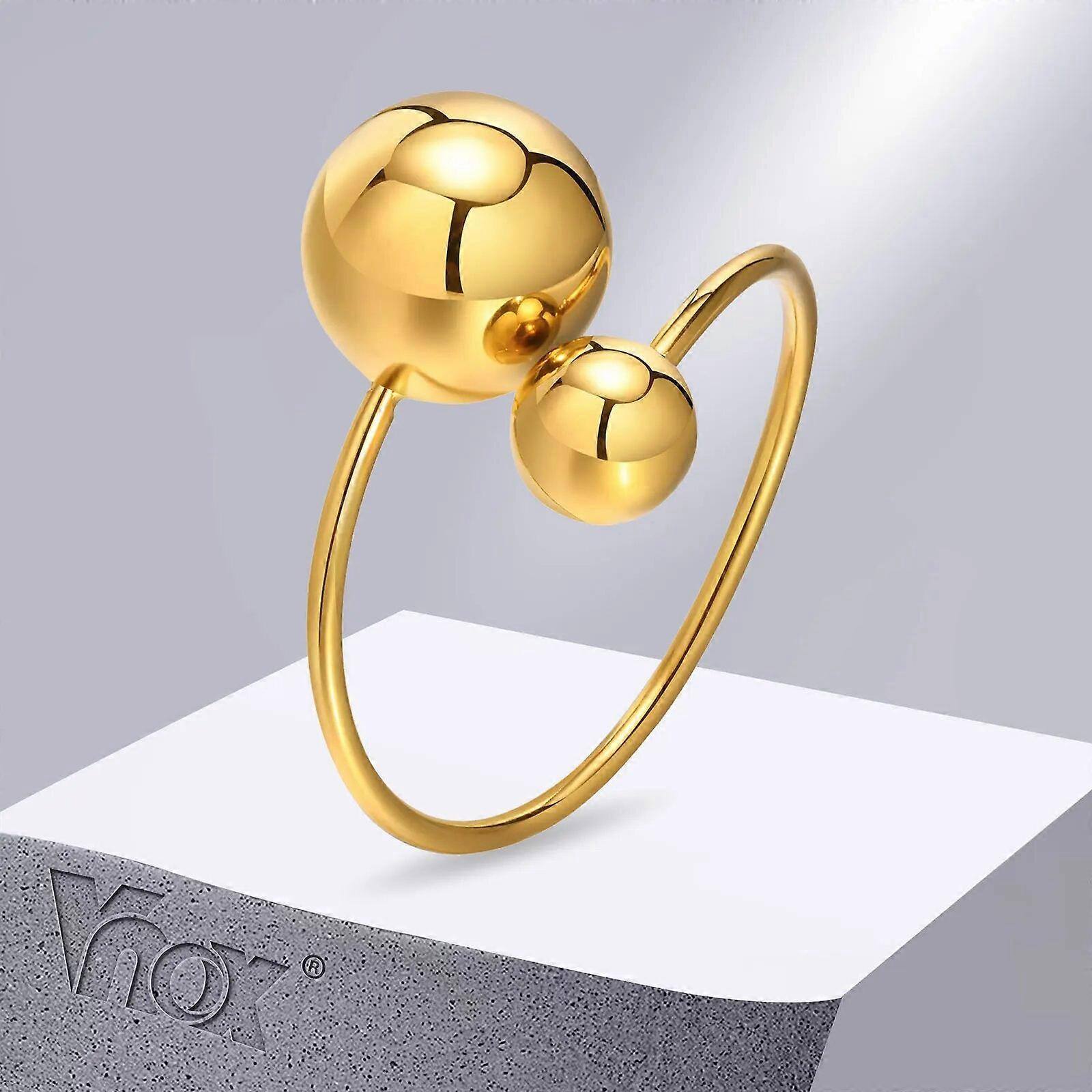 Chic Double Round Beads Rings for Women, Gold Color Stainless Steel Thin Line Finger Gift Ring Jewelry,Resizable