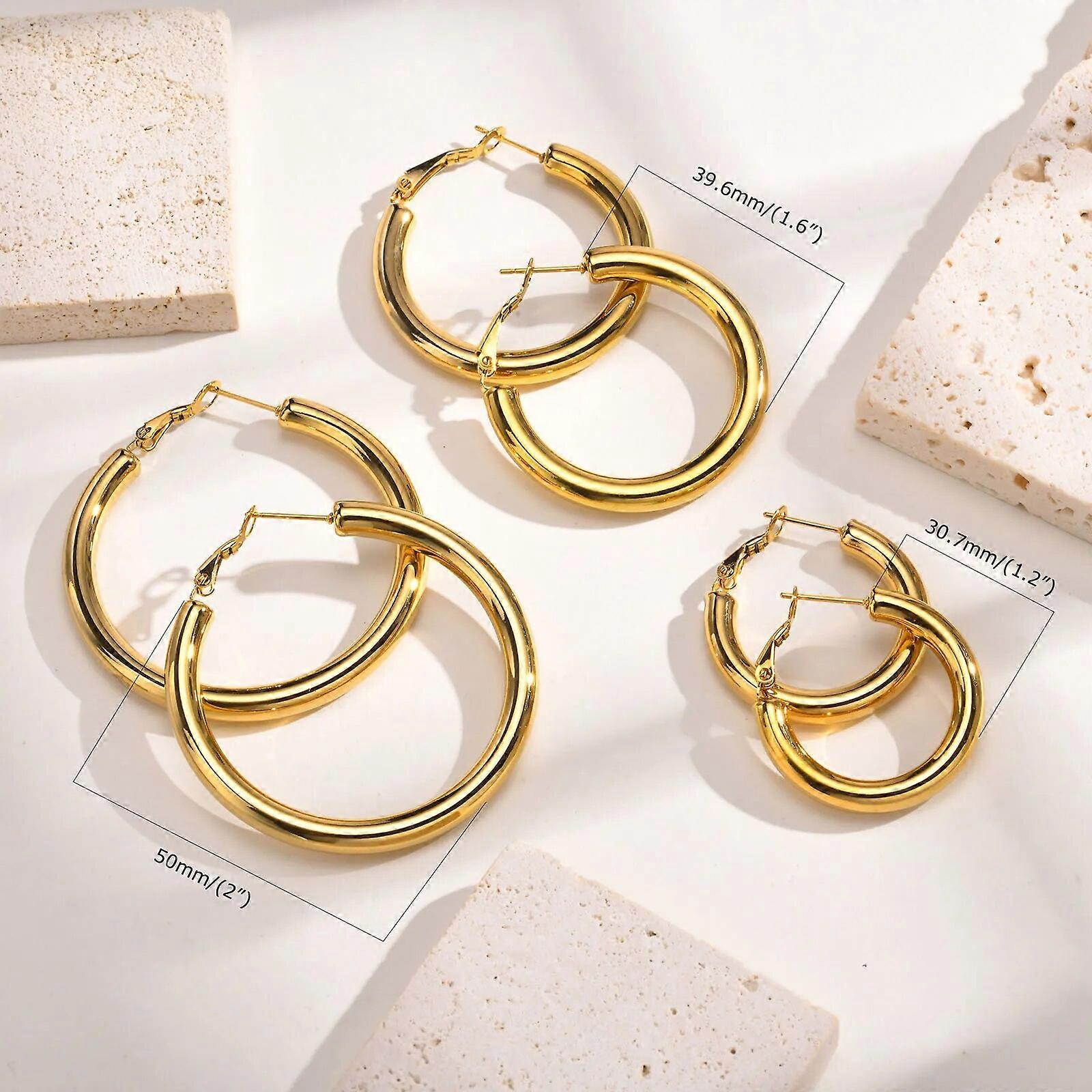 Simple Gold Color Chunky Tube Hoops Earrings for Women Lady, Lightweight Stainless Steel Round Earrings 30/40/50MM