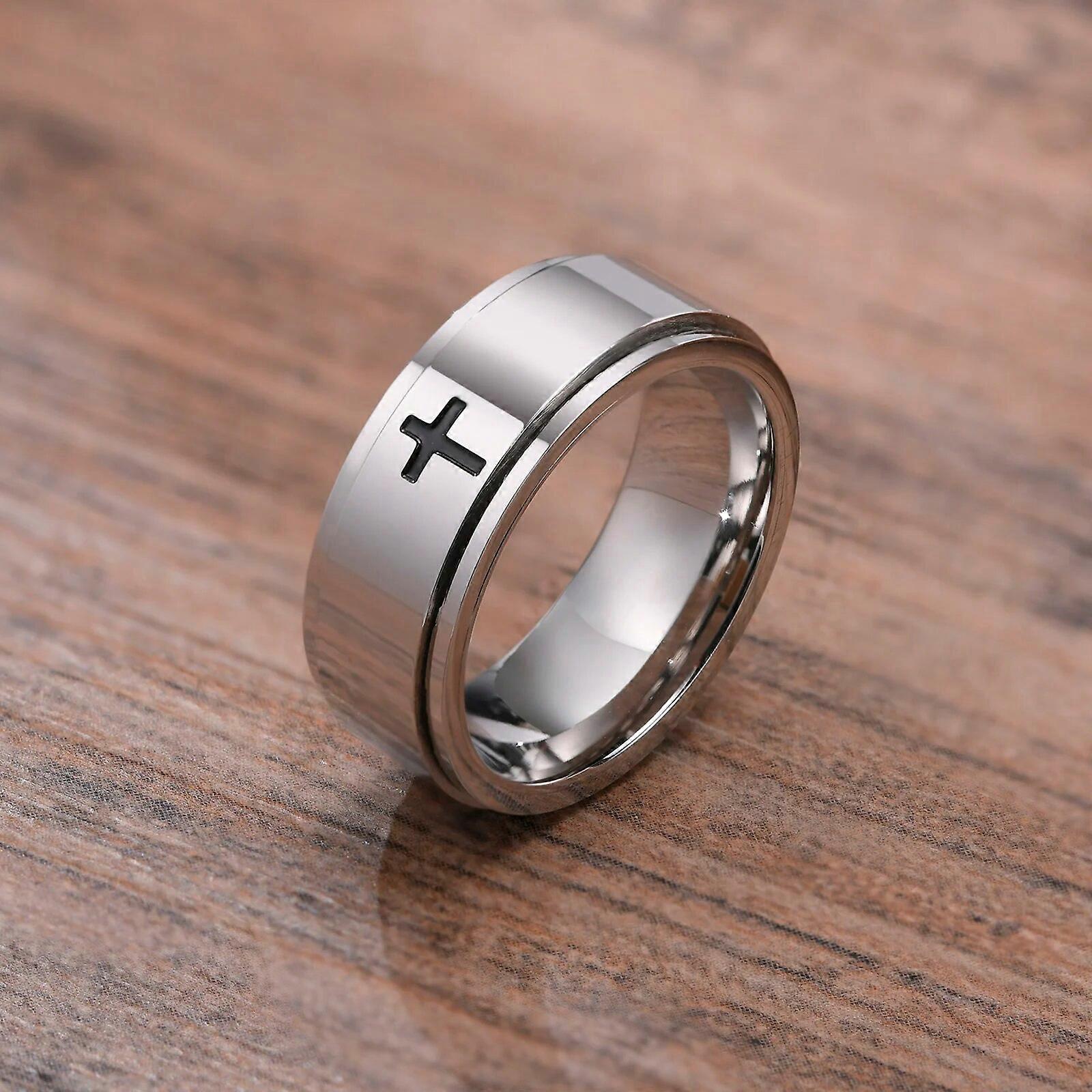 Spinner Cross Ring for Men, Black Stainless Steel Rotatable Stress Release Finger Band, Boy Christ Jesus Religion Ring