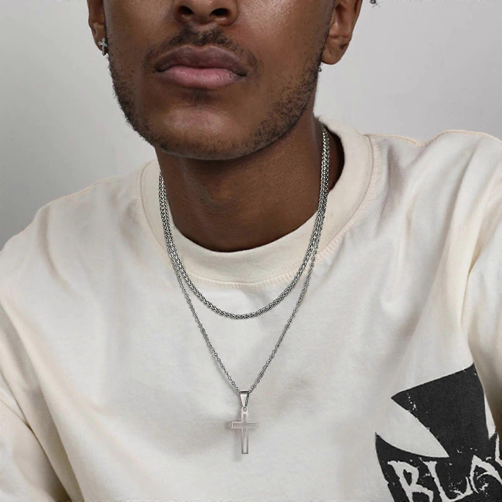 Men Layering Cross Necklace,Cutout Hollow Cross Pendant,Double Layered Gold Color Cuban Figaro Chain,Hippie 2pcs Collar Set