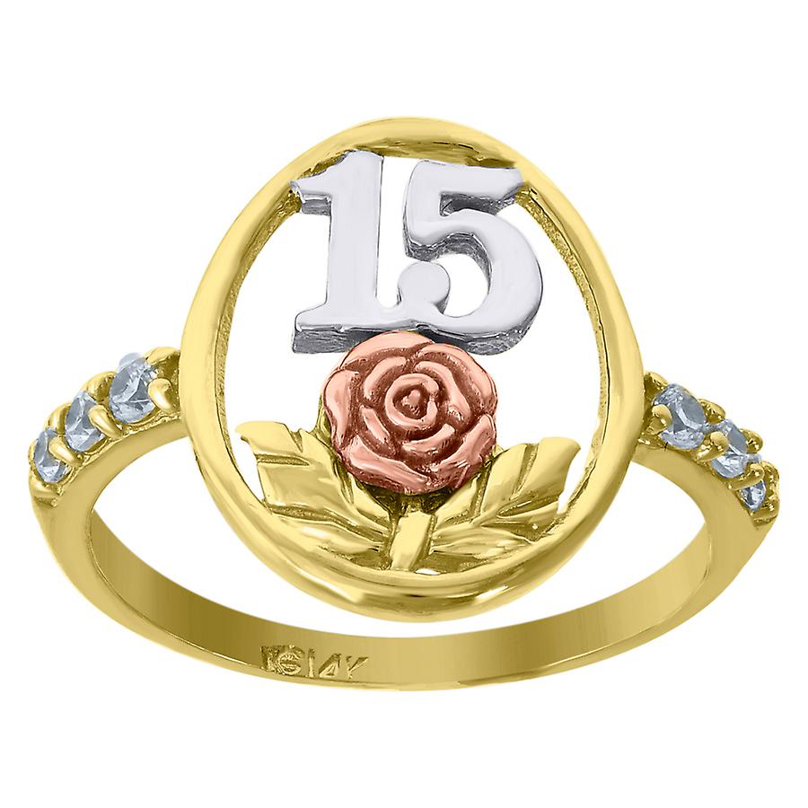 14k Gold Womens Tri color CZ 15 Anos Flower Rose Quinceanera Ring Band 14.3x1.3mm Wide Size 7 Ring for Women and Men