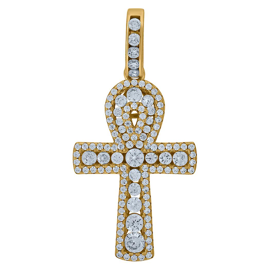 925 Sterling Silver Yellow tone Mens Cubic Zirconia Egyptian Ankh Cross Religious Charm Pendant 41x20mm Wide Necklace fo