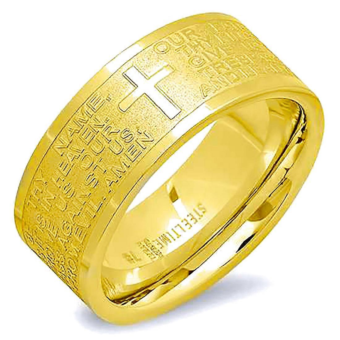 Stainless Steel Yellow-tone Mens Lords Prayer Cross Religious Comfort-fit Band Ring Wedding Band for Men - Ring Size: 9
