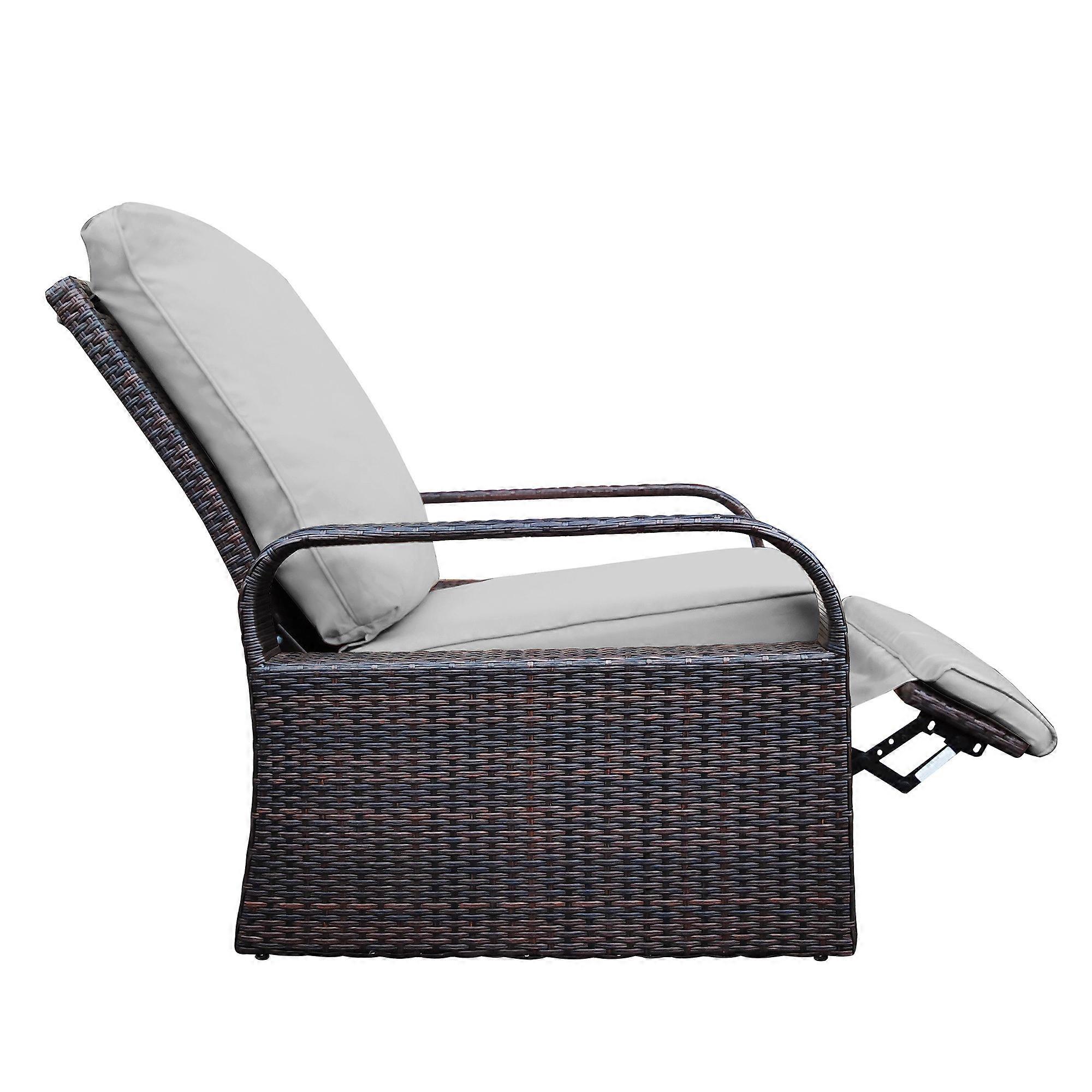 Outdoor Recliner, Automatic Adjustable Wicker Lounge Recliner Chair with Comfy Thicken Cushion, All Weather Aluminum Frame, Brown Wicker + Grey Cushio