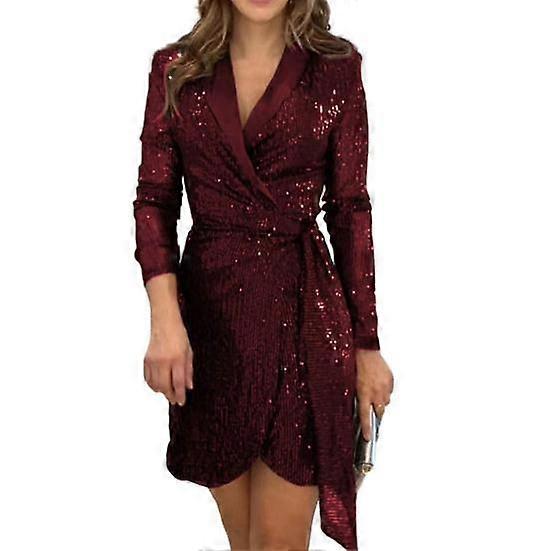 Lady Dress Lapel V Neck Lace Up Plus Size Wrap Tight Waist Shiny Sexy Sequin Long Sleeve Slim Fit