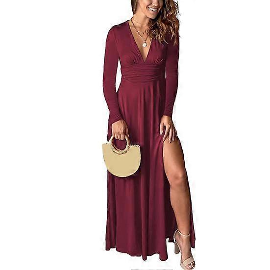 Women Dress Tight High Waist High Split Long Sleeve Deep V Neck Solid Color Soft Pleated Slim Fit Prom Party Banquet Maxi Dress