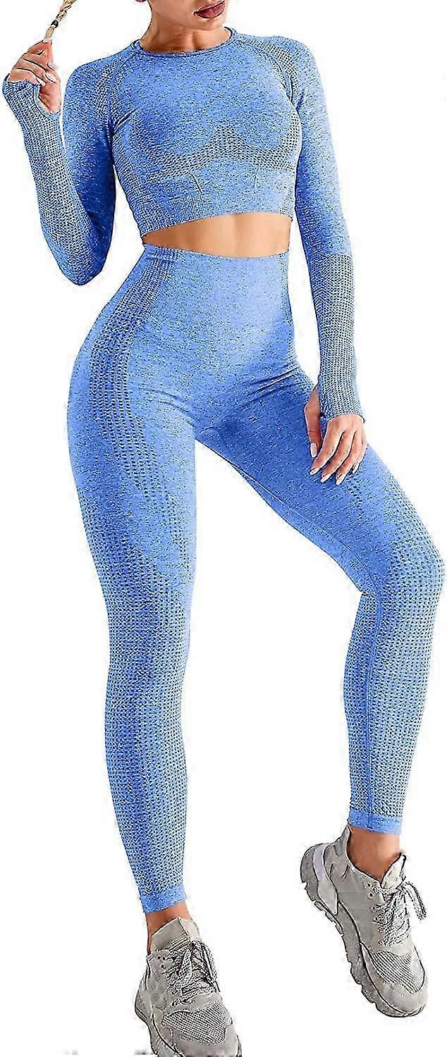 Yoga Outfit Set for Gym, High Waist Long Sleeve Top and Jumpsuit (Blue, S)