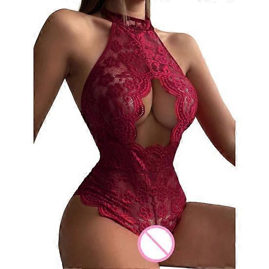 Women Sex Playsuit Hollow Out Lace Slim Fit Crotchless Solid Color Off Shoulder Skinny Halter Neck See-through Fishnet Backless Lady Sex Clothes