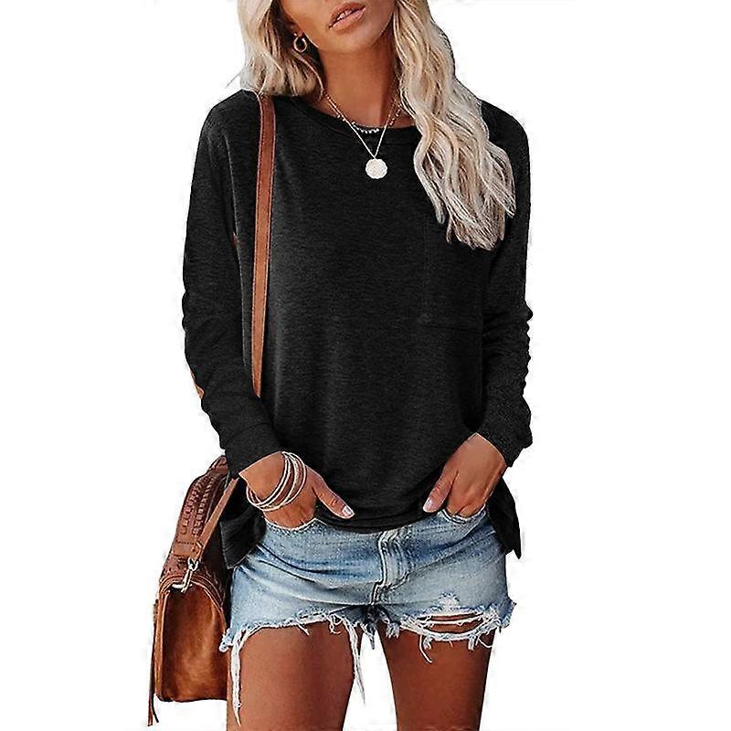 Spring and Autumn Women's Blouse Round Neck Pocket Split Casual Loose Long Sleeve Top