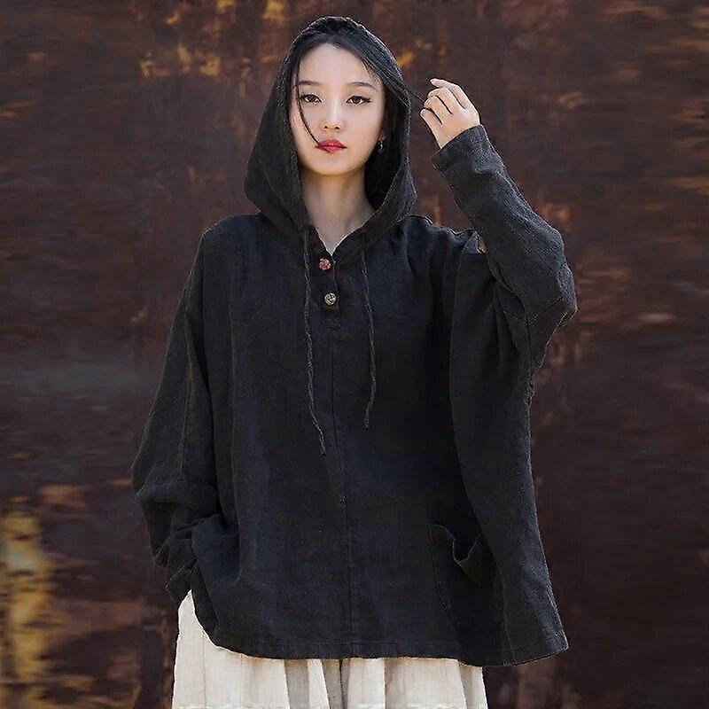 Johnature Women Vintage Hooded Linen T-Shirts Long Sleeve Loose Tees Autumn Button Solid Color Women T-Shirts