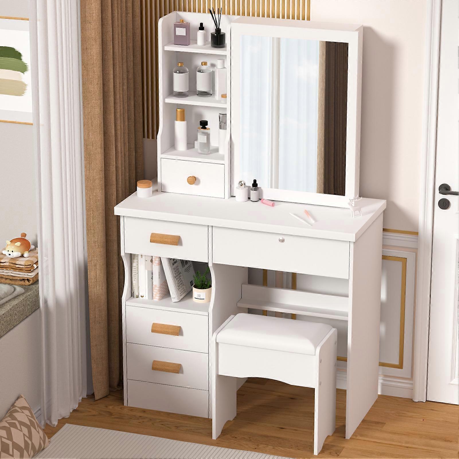 Dressing Table, Vanity Desk with Sliding Mirror, Bedroom Dressing Table, Makeup Desk with 6 Drawers, Open Shelves, Hidden Storage Space White