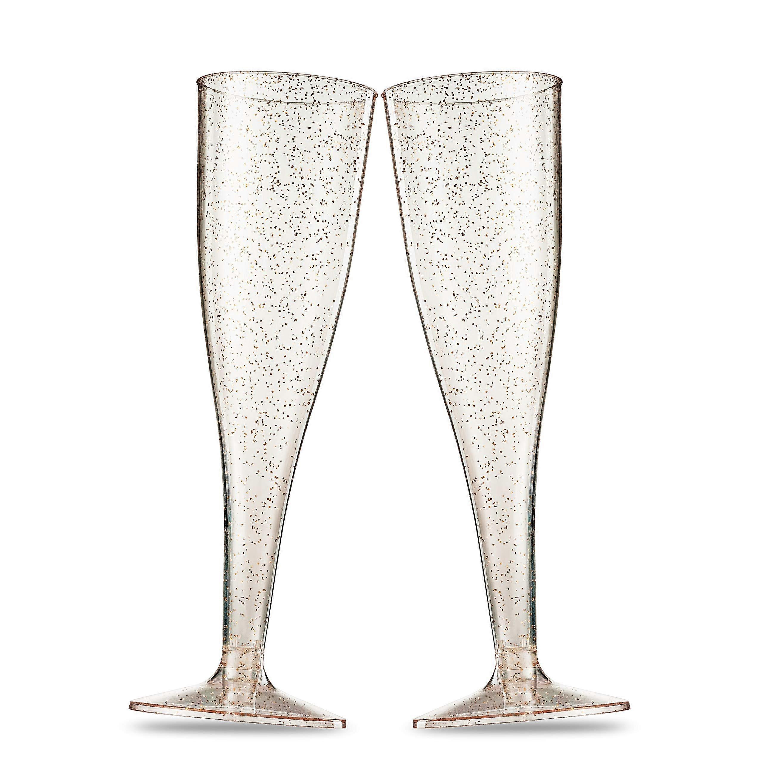 50 Disposable Gold Glitter Champagne Flutes for Weddings and Parties, 5.5 oz Plastic Toasting Glasses