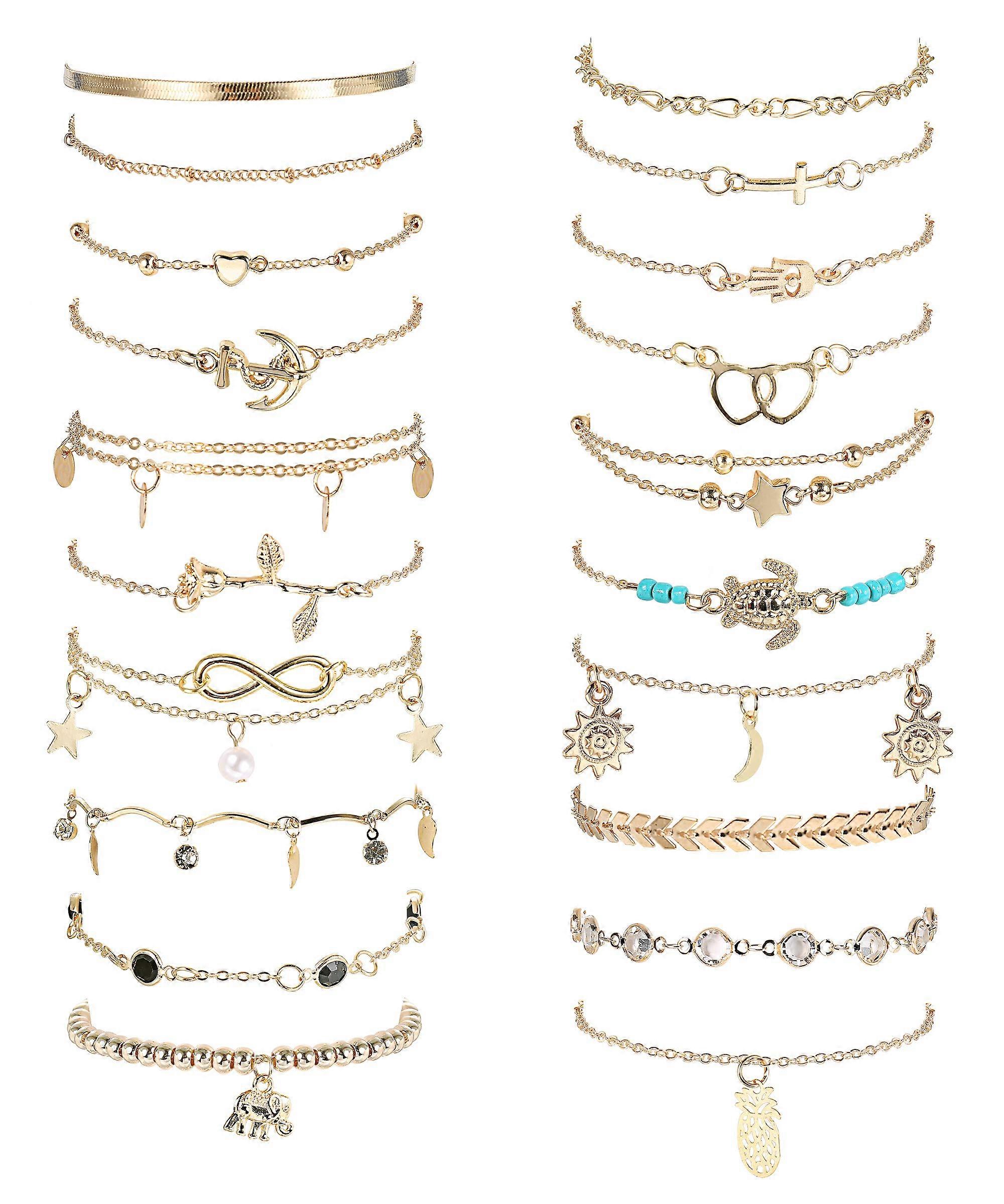 20pcs Adjustable Ankle Wrist Jewelry Set for Women - Surf Anklet with Heart, Star, Turtle Designs in Gold Tone