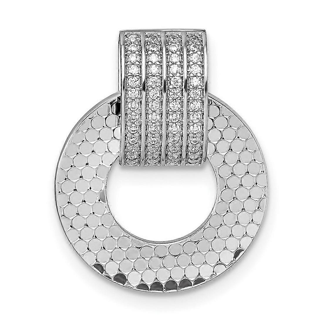 16.3mm Sterling Silver Rhodium Plated Cubic Zirconia Textured Moveable Reversible Circle Pendant - 2.9 Grams In Sterling Silver in Plated Metal - - Charm/Element Width: 16.3 mm - Charm/Element Thickness: 1.5 mm - Width of Item: 16.3 mm - Charm/Element Length: 16.4 mm - Length of Item: 25.9 mm - Bail Length: 10.5 mm - Bail Width: 6.7 mm - Finish: Polished - - This Item Does Not Ship With a Chain - [ Potential Enhancement Methods: cubic zirconia ] - Synthetic. Some are covered with a product that makes the stone more durable. - [ Care and Handling: cubic zirconia ] - Clean with warm soapy water and a soft cloth. -