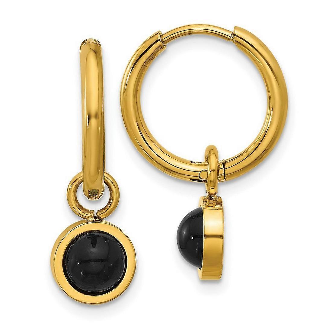2mm Stainless Steel Polished Yellow Ip Black Agate Dangle Hinged Hoop Earrings - Measures 27x2mm Wide 2mm Thick - 3.4 Grams In Solid Stainless Steel - - Thickness: 2 mm - Width of Item: 2 mm - Length of Item: 27 mm - Earring Closure: Hidden Wire & Catch - Earring Type: Hoop - Finish: Polished - Feature: Hinged - Feature 2: Moveable - Feature 3: Hollow - - [ Potential Enhancement Methods: black agate ] - Usually heated to improve appearance or deepen color. - [ Care and Handling: black agate ] - Do not expose to intense heat. Clean with warm soapy water and a soft brush or cloth. -