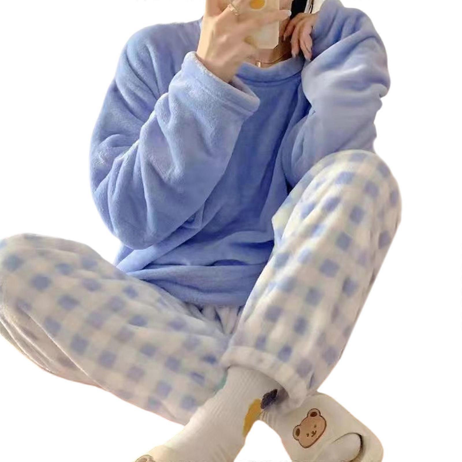 Women's Winter Pajamas Set Thick Fleece Sleepwear 2Pieces Long Sleeve Solid Top and Plaids Pants for Relaxed Home Wear Purple