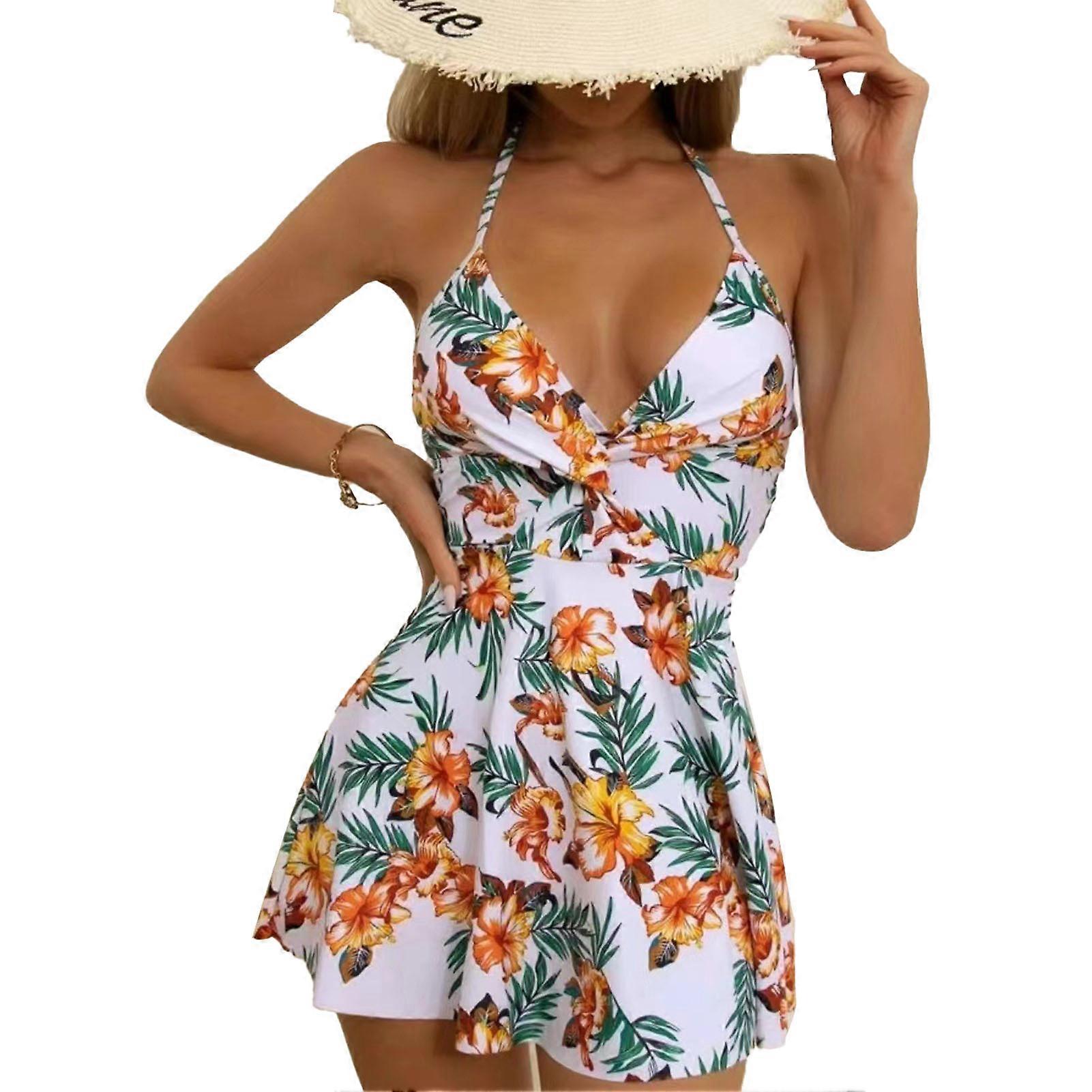 Tankini Swimsuit Tie Halter V Neck Backless Print 2 Piece Swim Dress with Bikini Bottom Chest Pad for Beach Pool