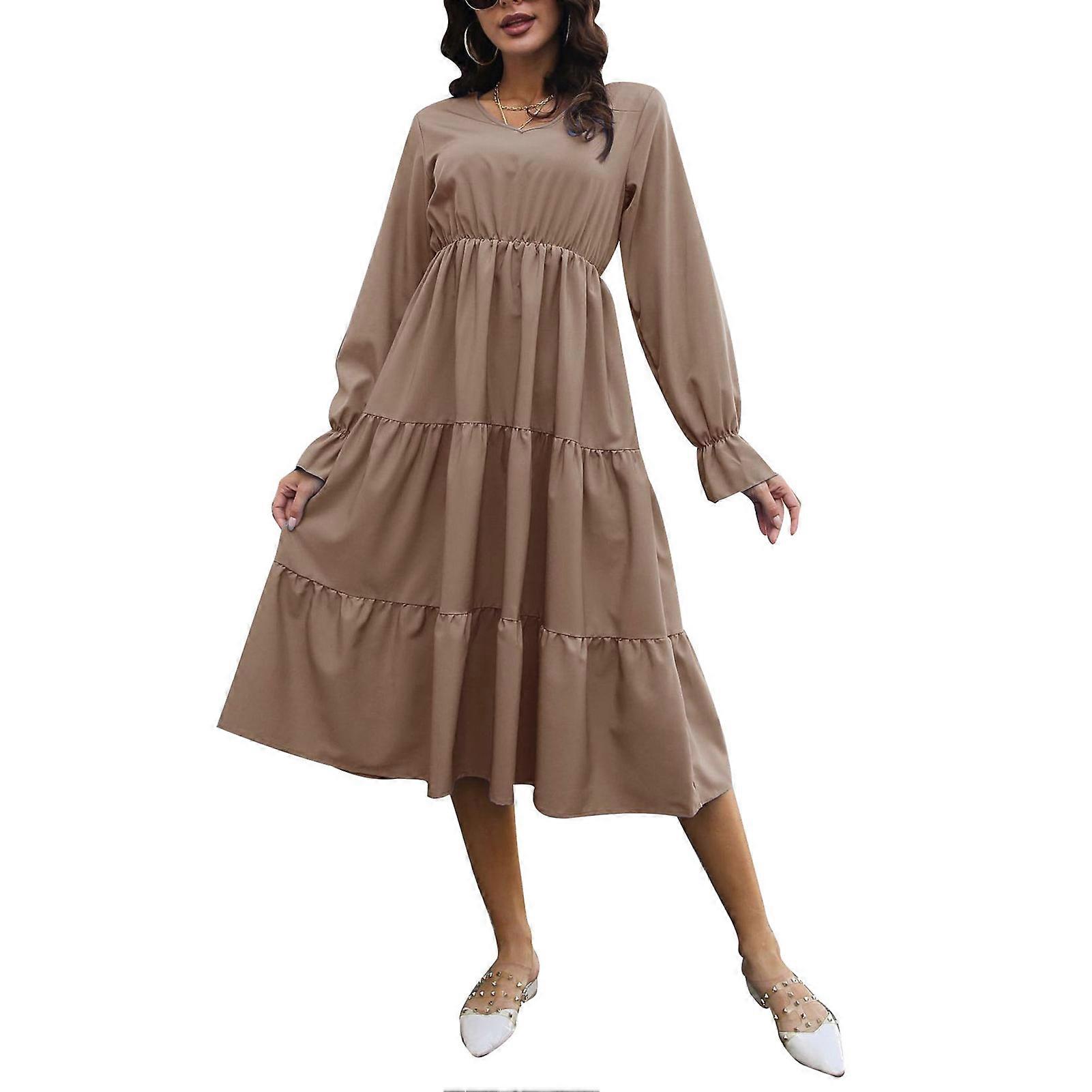 Women V Neck Lantern Long Sleeve Pure Color Elastic Waist Style Casual Flared Dress for Daily Life