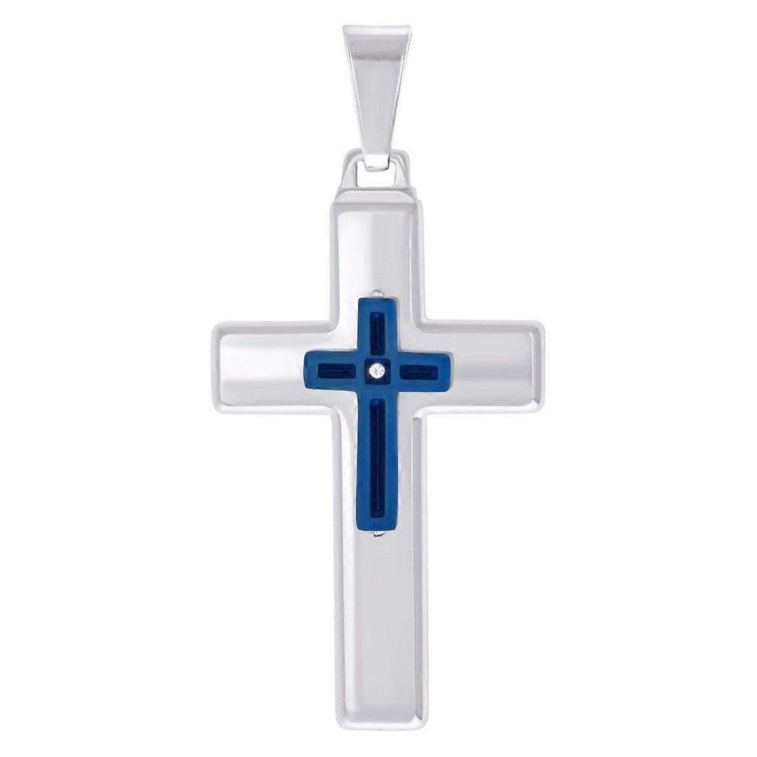 Stainless Steel Blue-tone Mens Cubic Zirconia Cross Religious Charm Pendant Necklace for Men