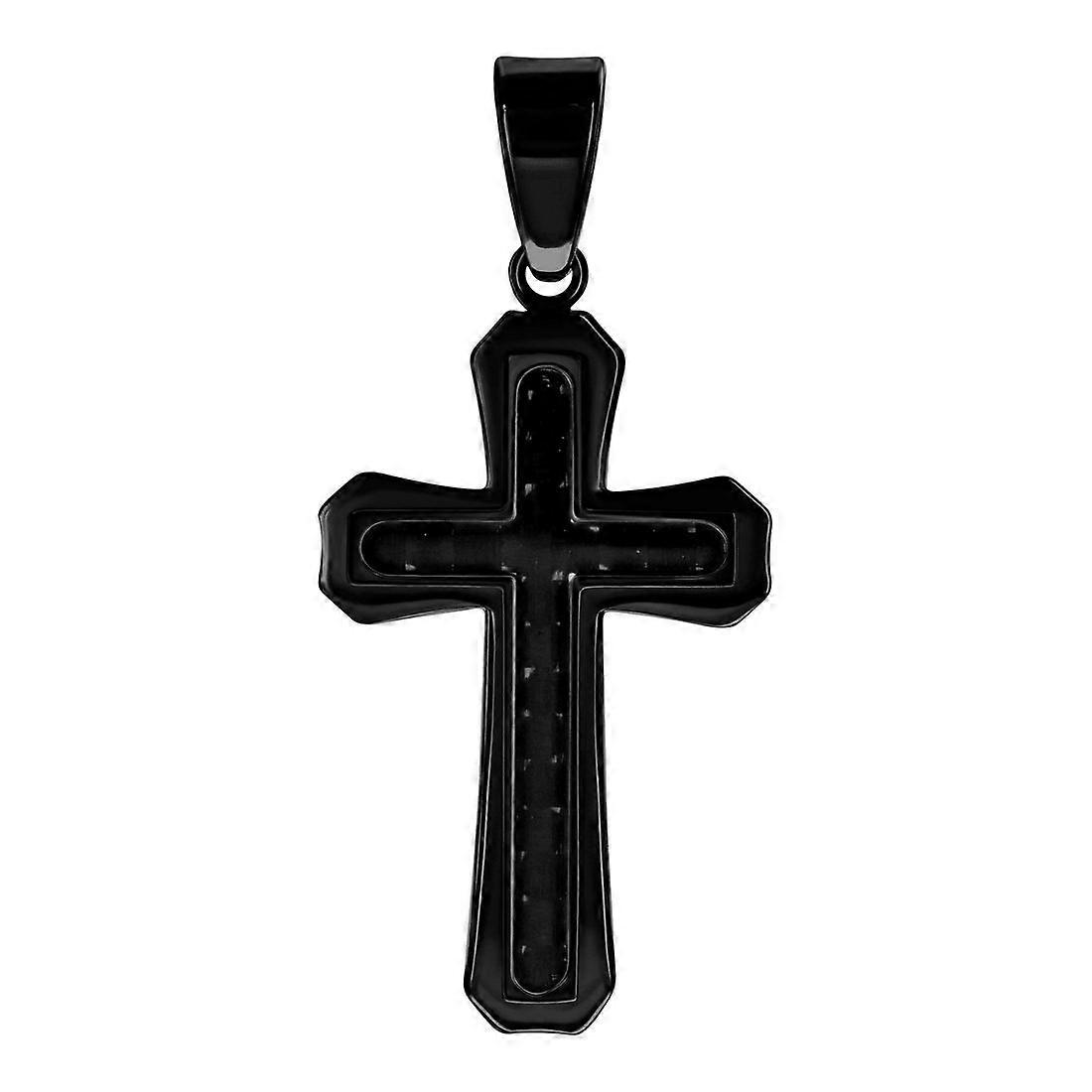 Stainless Steel Black-tone Mens Carbon Fiber Inlay Cross Religious Charm Pendant Necklace for Men