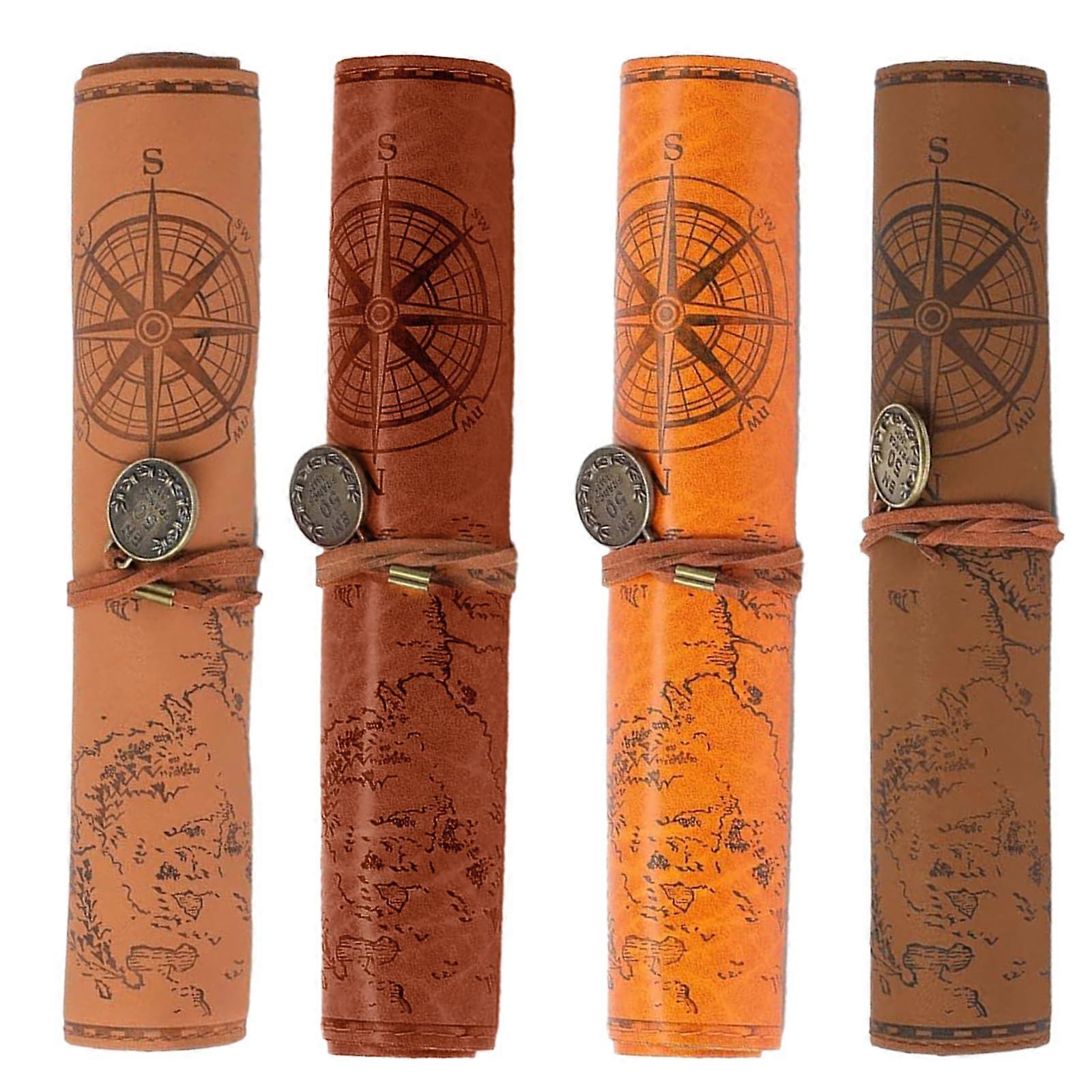 Leather Pencil Case Set of 4, Vintage Map Rollup Pouch for Makeup Brushes and Stationery, Brown PU Matte Storage Organizer