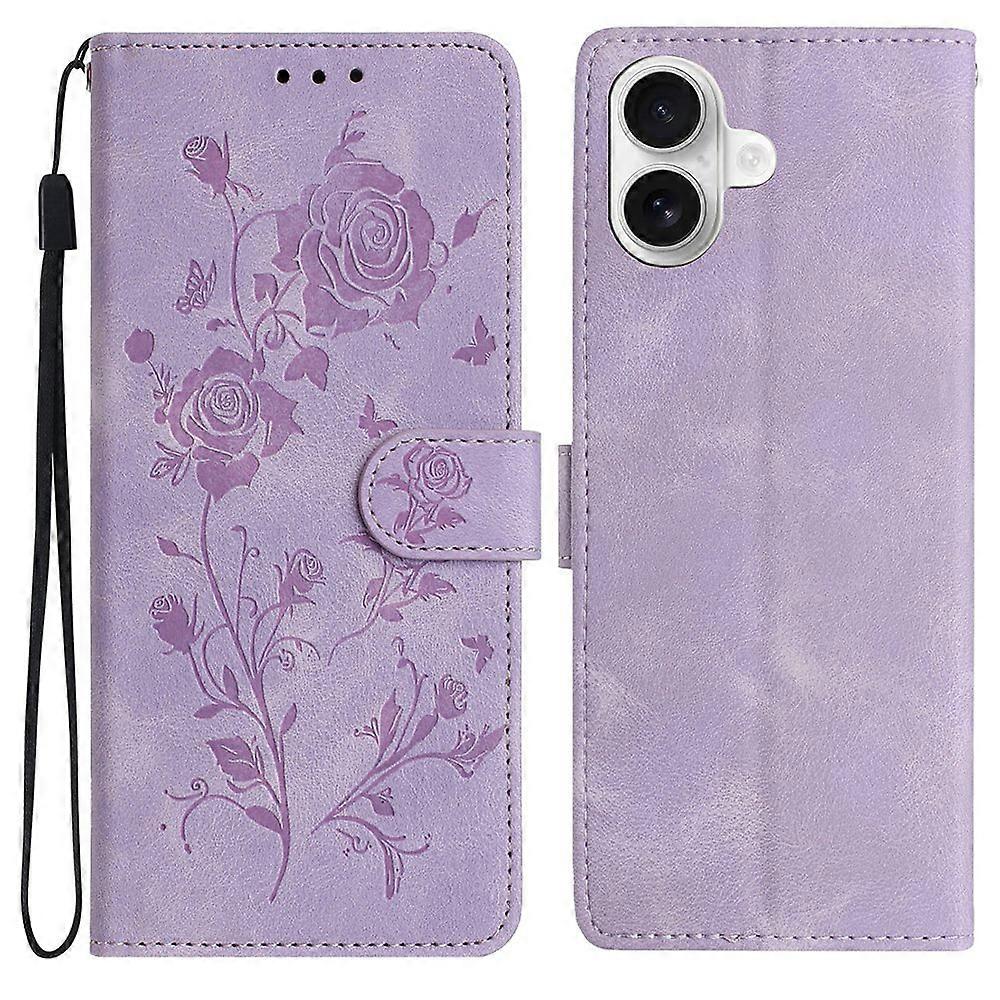 For iPhone 16 Wallet Case Rose Pattern Imprinted Leather Flip Stand Phone Cover - Light Purple