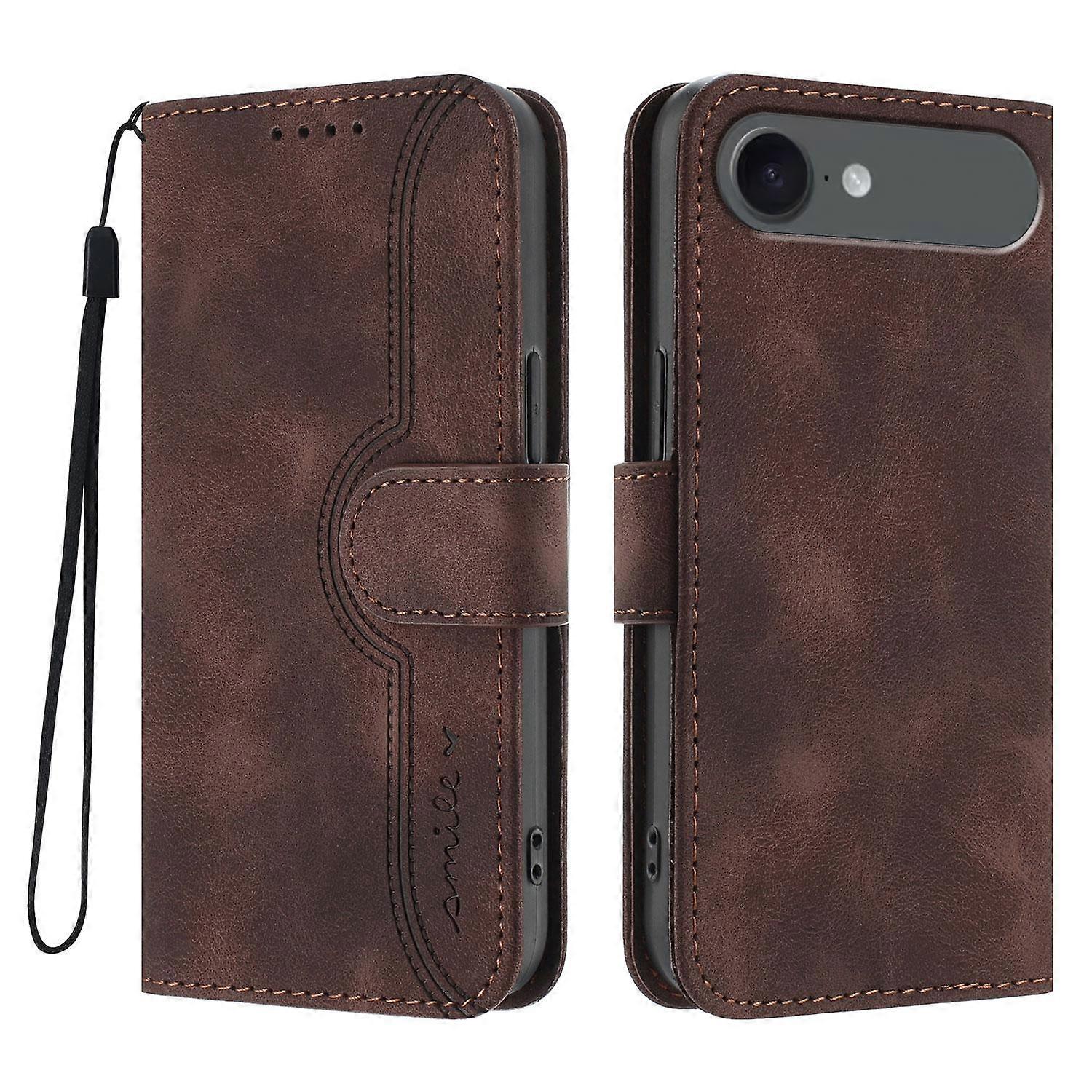 For iPhone 17 Air Leather Case Wallet Stand Smile Imprinted Phone Cover with Strap - Coffee