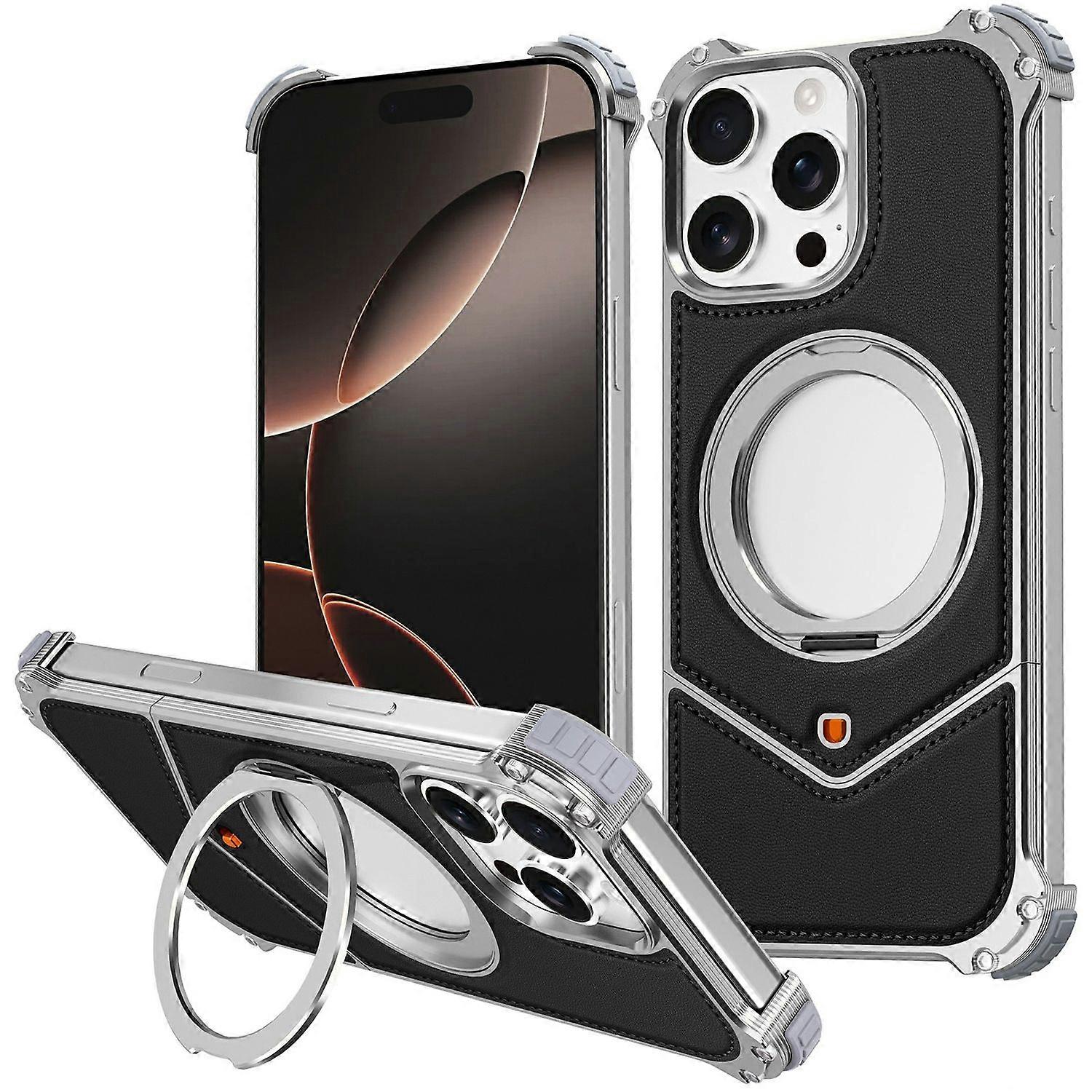 •【Frameless Premium Design】Crafted with a sleek, borderless aluminum alloy base covered in PU leather, delivering a minimalist aesthetic with a durable, high-end feel •【360° Rotatable Kickstand】Equipped with a sturdy, rotatable kickstand that supports multiple viewing angles for convenient hands-free use •【Corner Airbag Protection】Designed with raised, air-cushioned corners that absorb shocks effectively and provide reinforced protection against accidental drops •【Strong Magnetic Compatibility】Built-in magnet ensures firm alignment with MagSafe chargers and accessories, supporting fast, stable wireless charging without interference •【Precisely Aligned Cutouts】Features Precision cutouts that align perfectly with the phone's camera, buttons, ports, and speakers, ensuring seamless functionality and user convenience without removing the case Compatible with: •iPhone 16 Pro Package included: •1 x Phone Case •Other items not included
