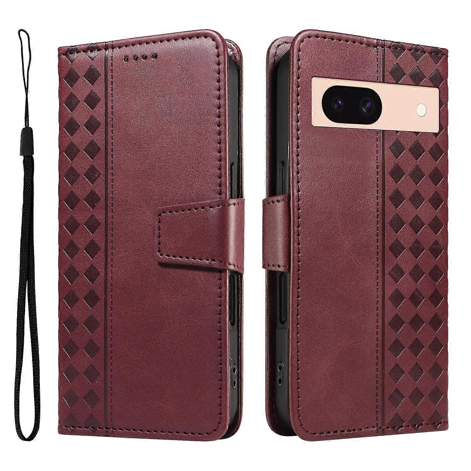 For Google Pixel 8a Leather Case Wallet Stand Grids Imprinted Phone Cover with Strap - Wine Red