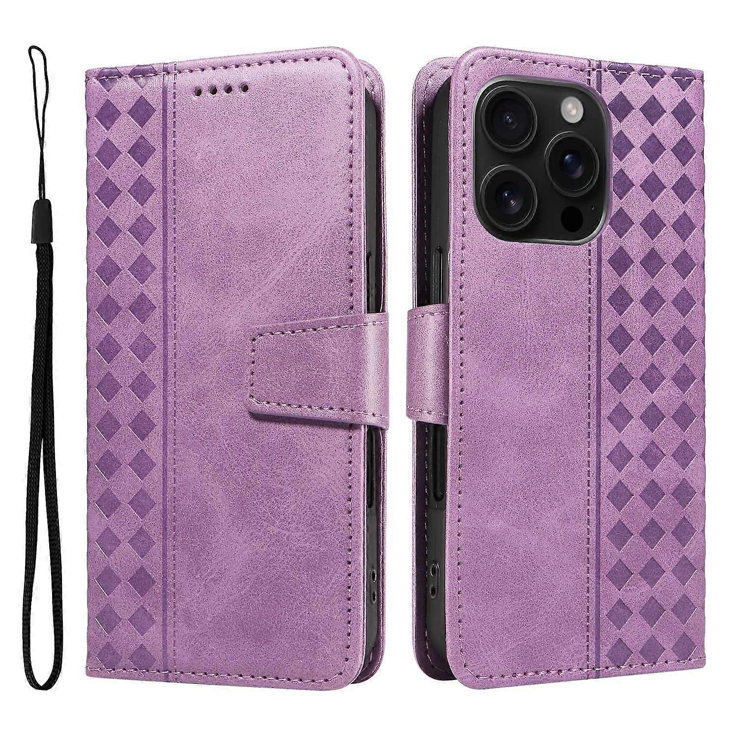 For iPhone 16 Pro Leather Case Wallet Stand Grids Imprinted Phone Cover with Strap - Light Purple