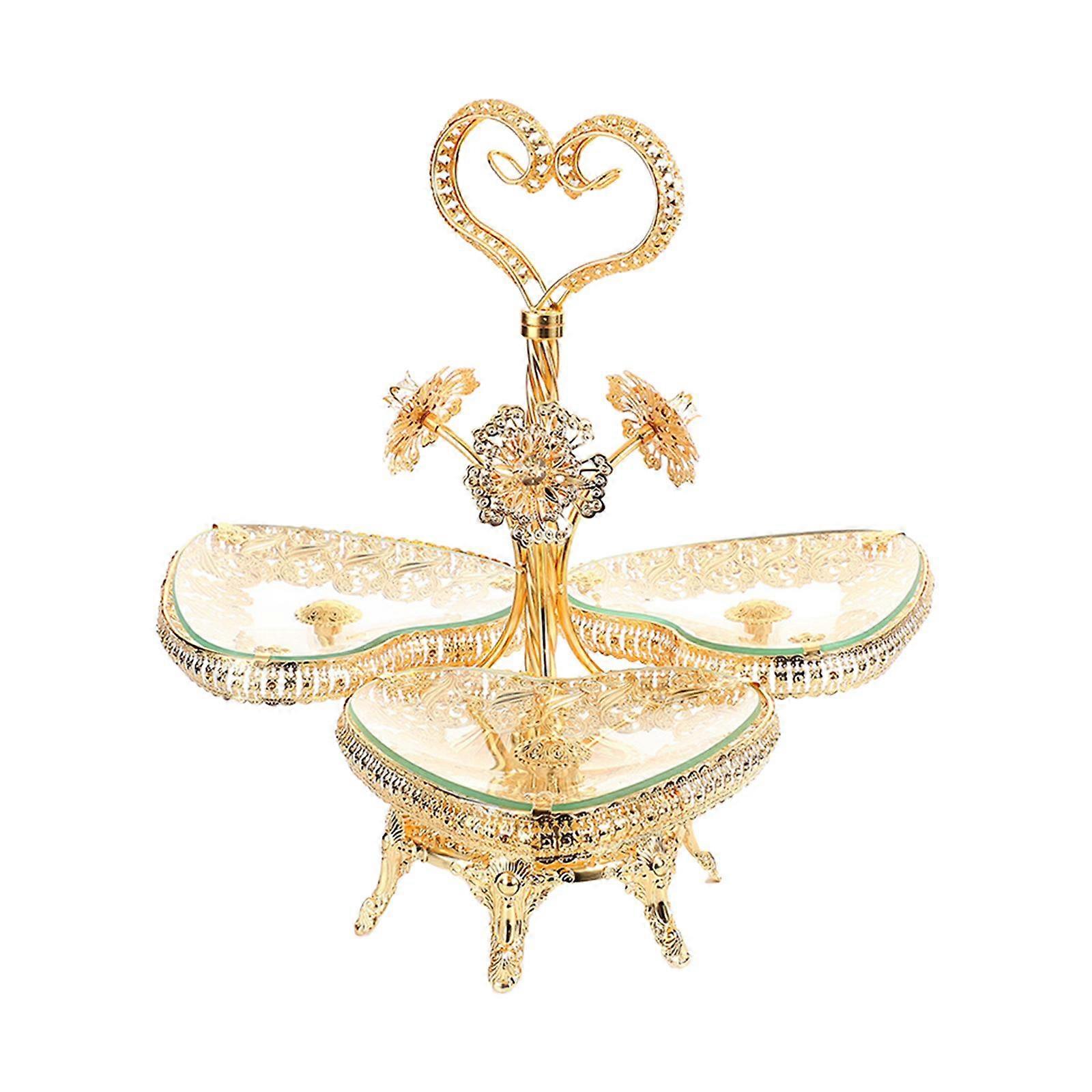 Description: 【Material】: This fruit basket serving tray is made of quality glass and iron frame, smooth surface, practical and strong 【Elegant Design】: The dessert display rack appearance features vivid flower designs, paired with heart shaped fruit plates, giving you a stylish visual experience, suitable for restaurant or table decoration 【Table Centerpiece】: The divided serving platter based on european feelings, our serving tray reflect strong artistic atmosphere,it can attract attention and bring the party experience 【Wide Used】: This handheld fruit platter can be placed in the living room, bedroom, store fruits, snacks, keys, etc, can do decoration, can also do the plate, placed in the living room corner, a very beautiful landscape. 【Multifunctional】: The fruit tray elegant for appetizers, cookies, cakes, fruit, desserts, and so much many, Is suitable for birthday, tea party, wedding, christmas and everyday use, etc Specification: Material: Glass and Iron  Size Chart: 42cmx42cmx41cm/16.54inchx16.54inchx16.14inch Package Includes: 1 Fruit Tray Note:Customer satisfaction is our primary concern. If the product is somehow cracked or broken during shipping, please feel free to contact us. We will try our best to give you a satisfactory solution.