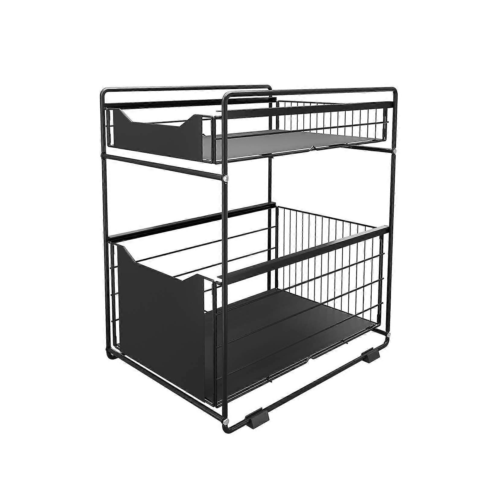 2 Tier Organiser Under Sink Storage Basket Pull Out Snack Organiser for Kitchen Bathroom Office Black
