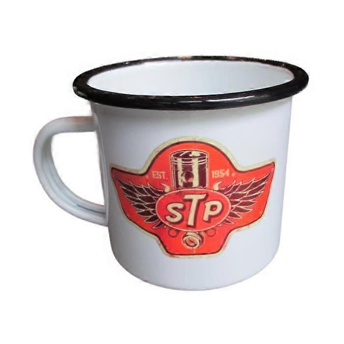 STP EAST 1954 logo enamel mug with a plunger, 2 logos on the same mug. Very good quality mug, however tiny imperfections on the inside of the handle are common as the mugs are hung by the handle to go in the oven! Be careful, no microwave with these mugs!! It's metal!!