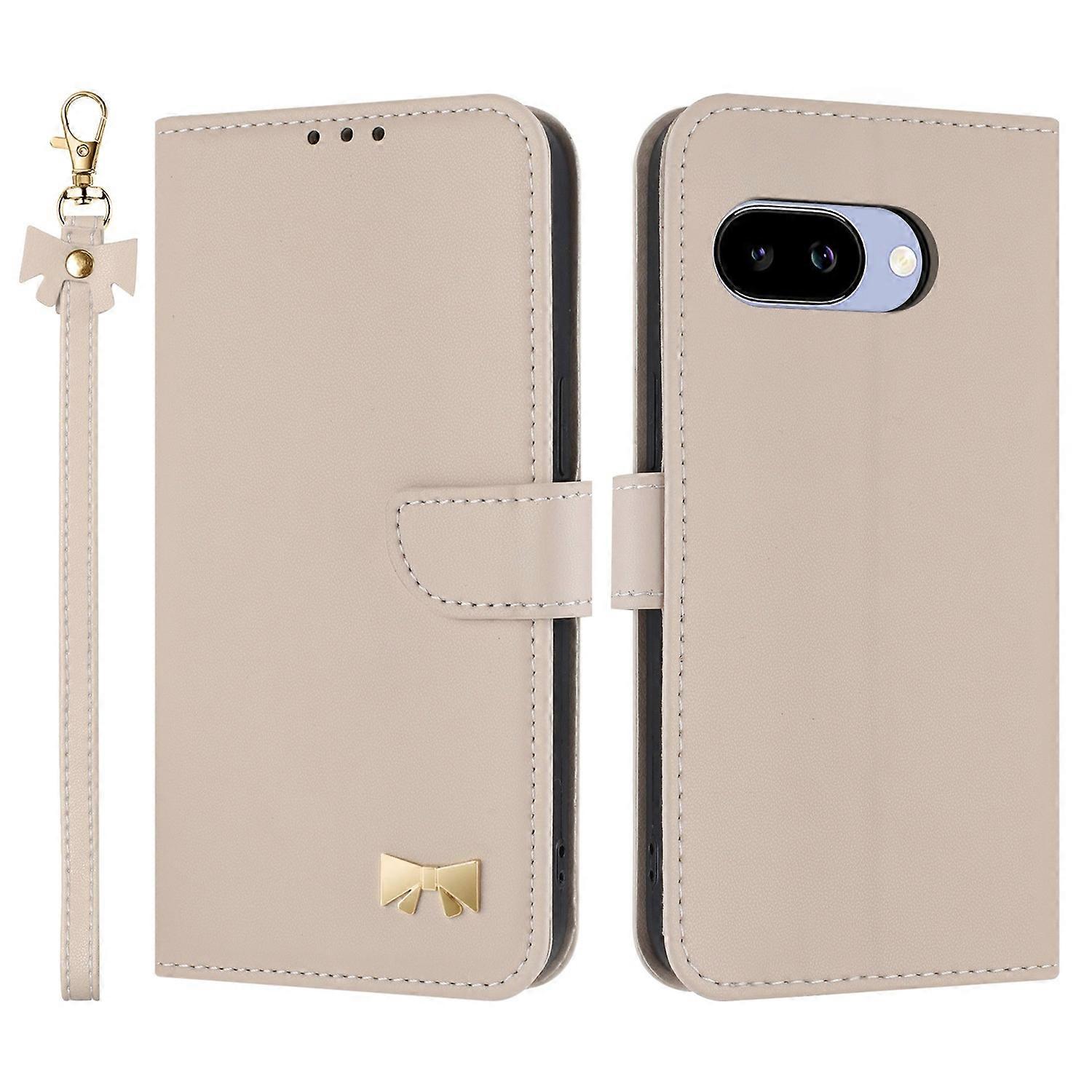 For Google Pixel 9a Case Bowknot Decor Wallet Leather Phone Cover with Wrist Strap - Khaki