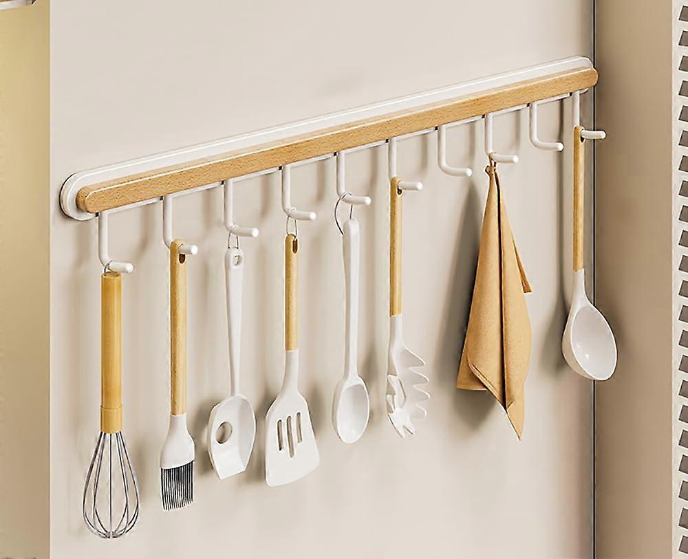 Kitchen Organizers and Storage Rack, 55cm Wall-Mounted Kitchen Utensil Rail, No Drilling Wood Iron, 10 Hooks, White