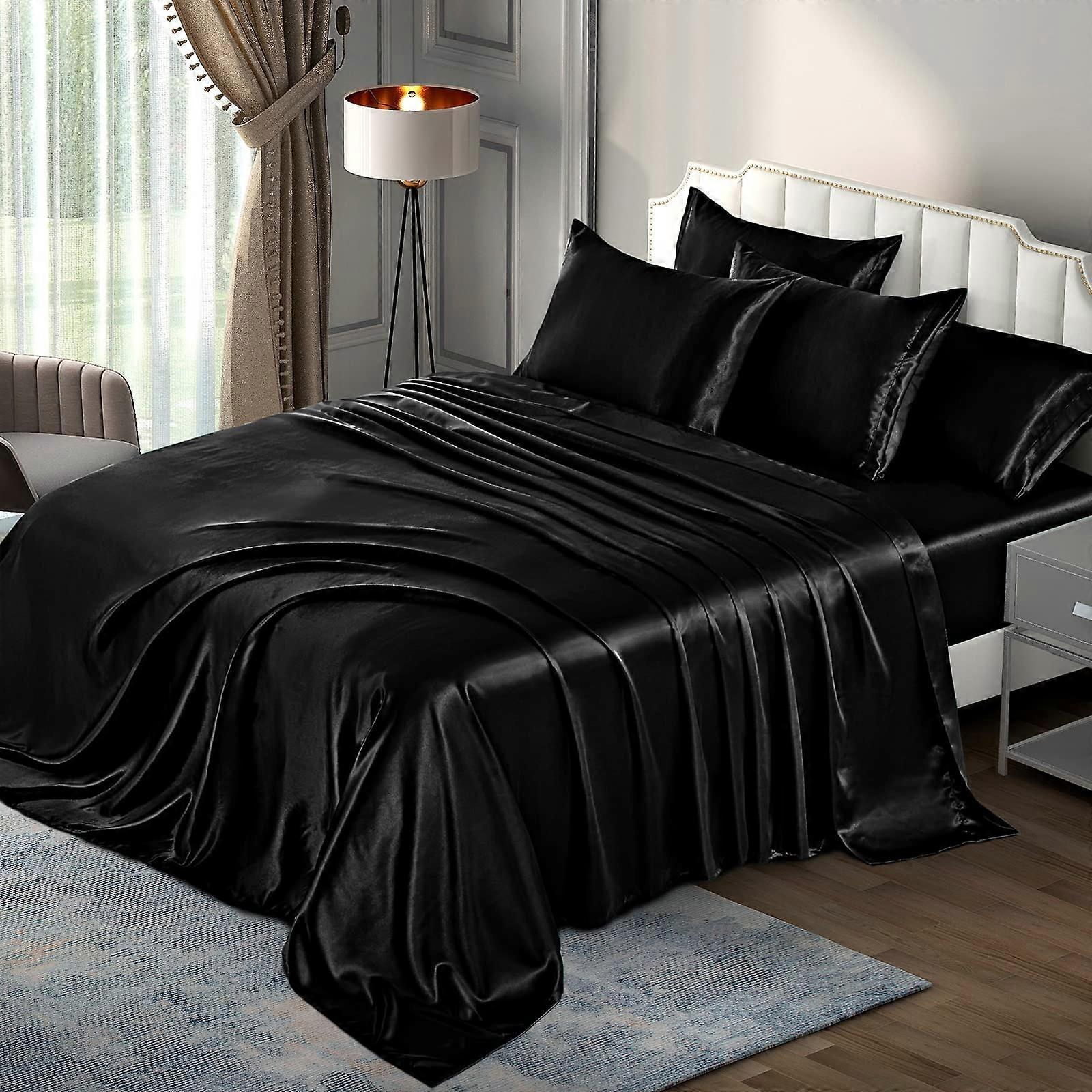 6 Pieces Luxury Silky Black Bedding Satin Sheet Set Queen Size 6-Piece Deep Pocket Machine Washable