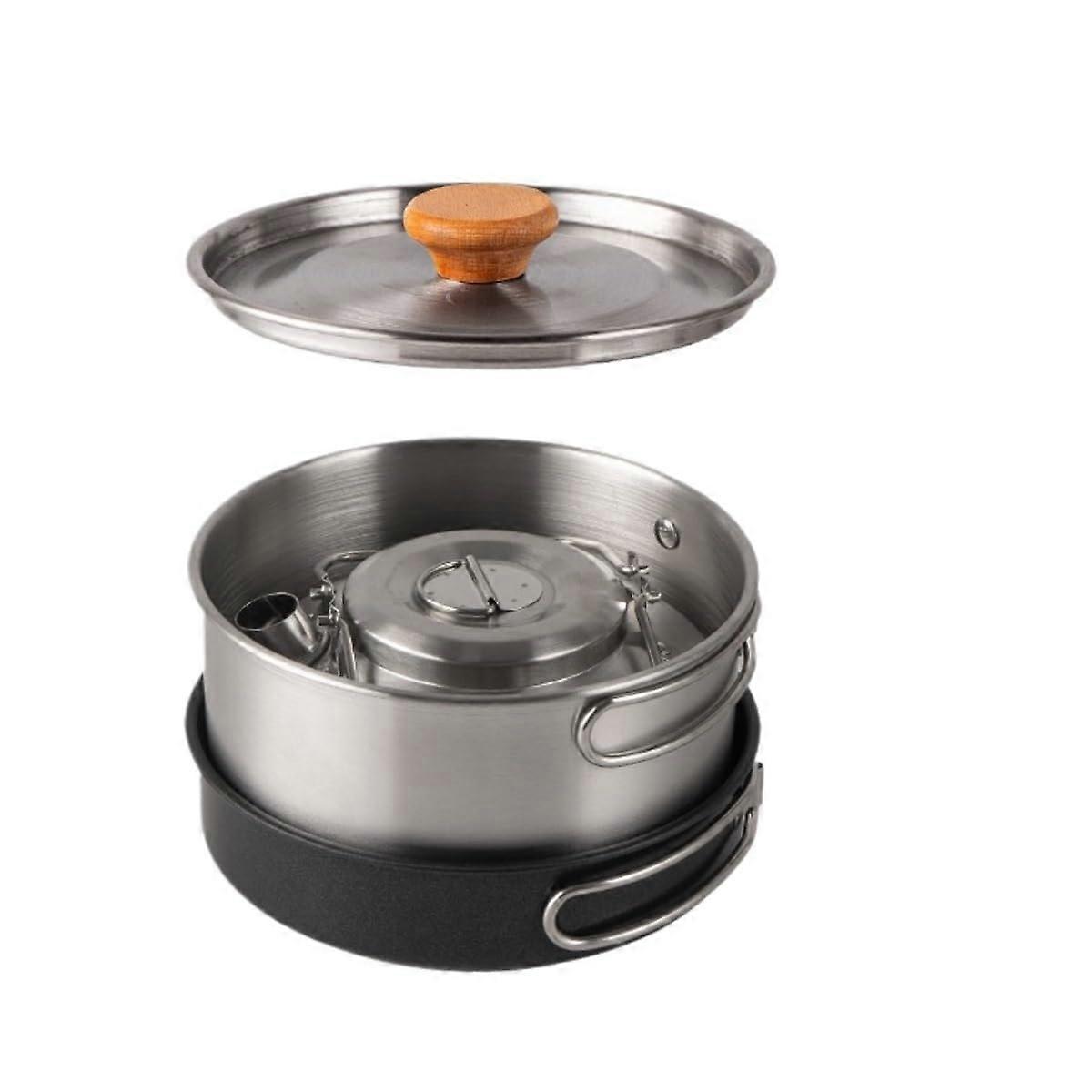 Camping Tableware Outdoor Stainless Steel Cookware Set, Portable Kettle, Soup Pot, Non-Stick Frying Pan, Silver 165x90mm