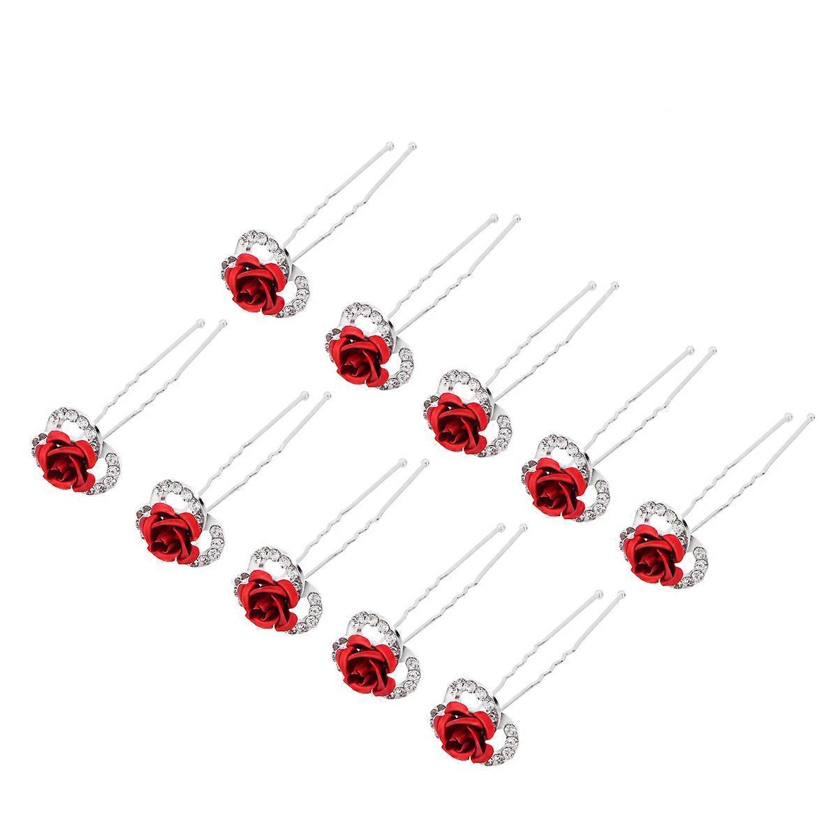item is a simple and delicate womens hairpins with flower design. It is mainly made of premium alloy material which are decorated with bling crystal and pearls with leaves design, which make it more beautiful and attractive. Therefore, wearing this hairpin in some occasions, you will look more charming and graceful. Features - Brand: Frcolor. - ColorRed - Material: Alloy. - Size: Approx. 8 * 2.4 * 2.4cm/ 3 * 0.94 * 0.94 inches (L*W*H). - Chic design with impeccable crafsmanship. Suitable for most and teenager girls to wear. - Each one is inlaid with flower on top, more elegant and beautiful. - Wearing graceful hairpin in some occasions, you will look more charming and graceful. - Perfect for your prom, dancing party, engagement, wedding or any other special soiree. Package list: 5 Pairs Frcolor Red Hair U-shaped Rhinestone Flower Hairpin Clips Bridal Hair Accessory Wedding Headpiece