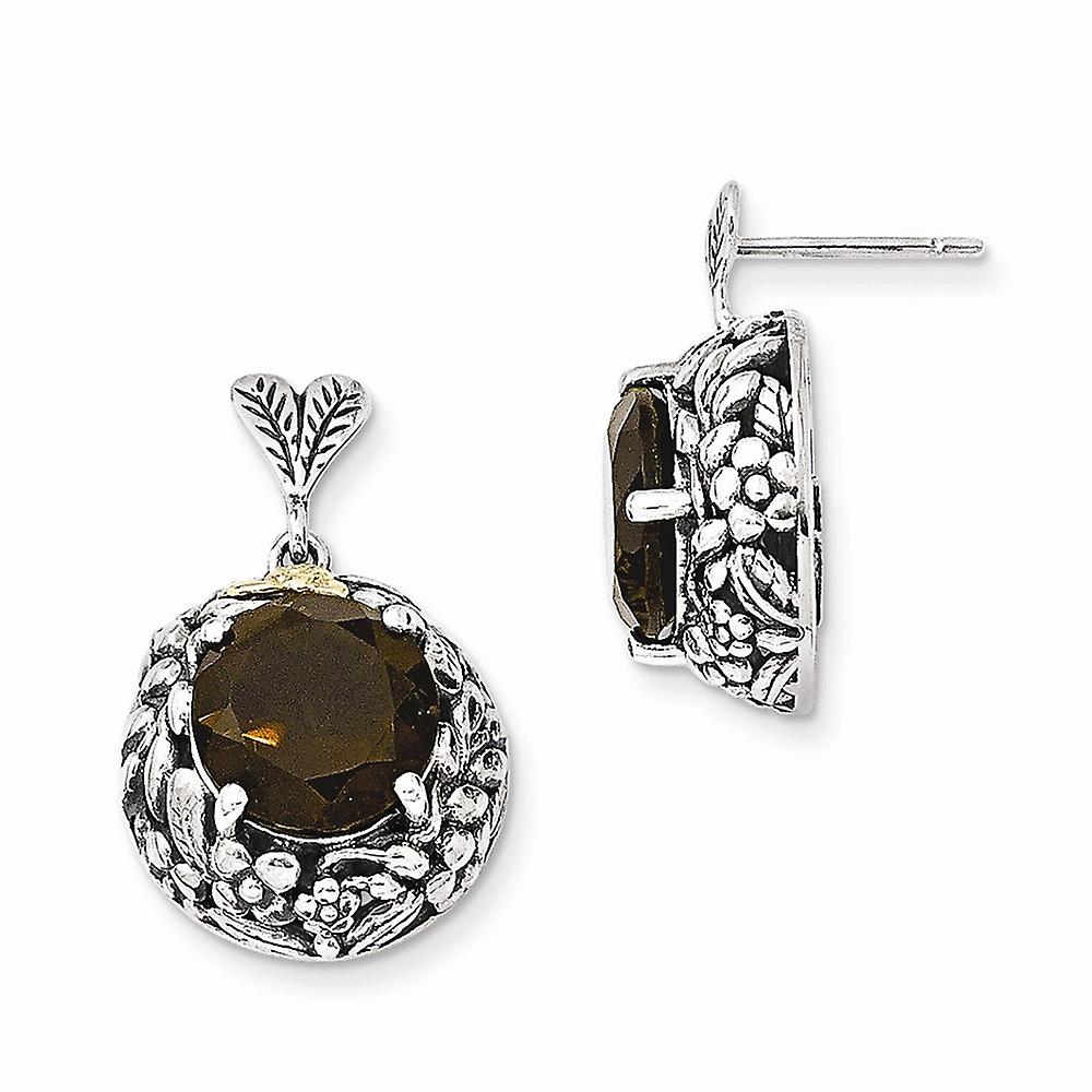 Sterling Silver With 14k Smokey Quartz Post Dangle Earrings - Measures 26x16mm Wide - 6.70 Carat Gemstone Weight in 14k Yellow Gold and White Gold - Product Attributes: - Antique finish - - Width of Item: 16 mm - Length of Item: 24.5 mm - Earring Closure: Post & Push Back - Earring Type: Drop & Dangle - Finish: Polished & Antiqued - - [ Potential Enhancement Methods: smokey quartz ] - Usually dyed and/or heat treated to produce different colors. Sometimes surface enhanced with a coating to enhance color. - [ Care and Handling: smokey quartz ] - Avoid abrasives, harsh chemicals, steam, and ultrasonic cleaning. Clean with warm soapy water and a soft brush or cloth. -