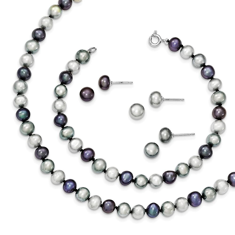 Sterling Silver Freshwater Cultured Pearl 18 In Neck. 7.25 In Bracelet and 3 Piece Ea - in Sterling Silver - Product Attributes: - Post Earrings - Spring Ring - - Length of Item: 18 in - Chain Length: 18 & 7.25 in - Chain Width: 6 to 7 mm (range) - Clasp /Connector: Spring Ring - Earring Closure: Post & Push Back - Earring Type: Ball - Finish: Polished - Chain Type: Pearl - Feature: Hollow - - [ Potential Enhancement Methods: Cultured Pearl ] - Usually bleached and polished to achieve uniform color and shape. May be dyed or irradiated to produce various colors. - [ Care and Handling: Cultured Pearl ] - Do not use ultrasonic cleaner or steamer. Avoid contact with cosmetics, hair spray, perfume and household chemicals. Clean with a soft cloth. -