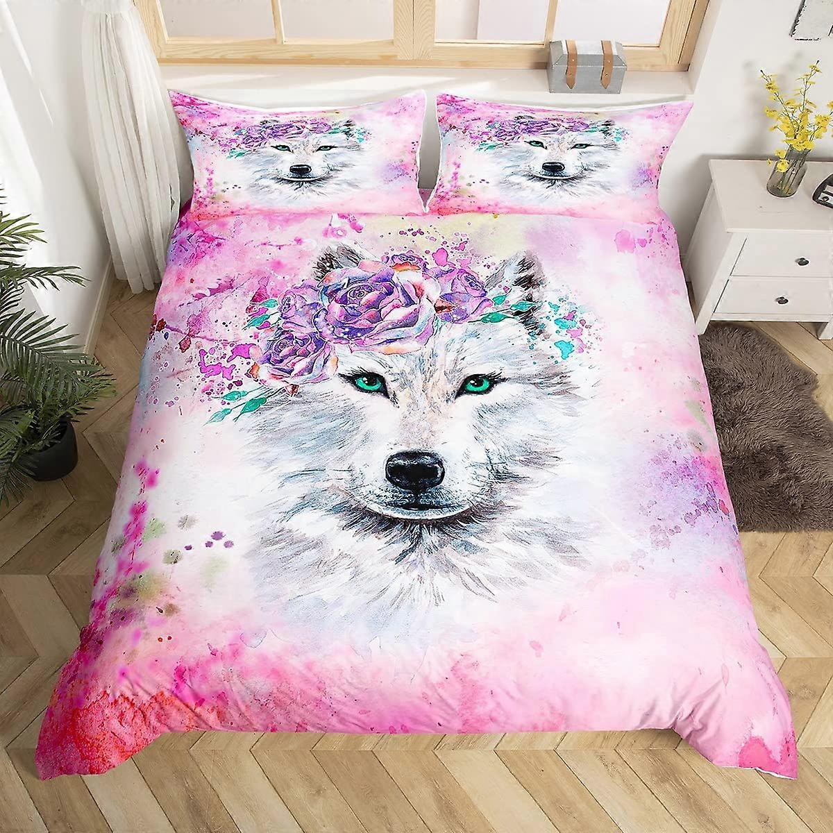 Twin Size Comforter Cover Set Tie Dye Pink Print 3D White Wolf Design Animal Room Decor Bedspread Cover Twin