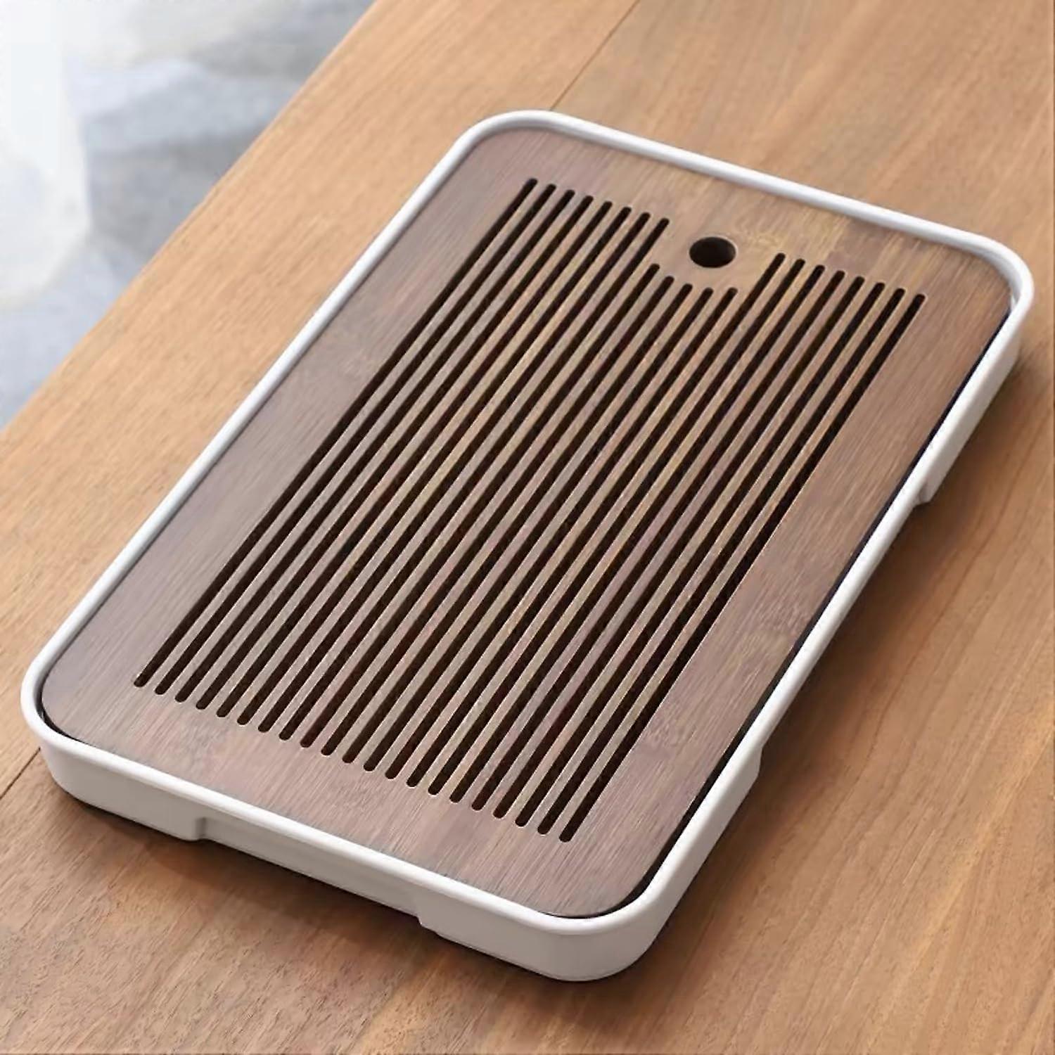 Premium materials: Selected fine bamboo wood and Melamine. Simple, elegant shape with a smooth texture and even color. Exquisite workmanship: The tray panels are arranged with orderly spacing to support neat tea discharge and reflect careful craftsmanship. Water drainage and storage: Dual-use drainage design directs waste water into the tray interior, helping keep the table surface clean and free of spills. Easy to clean: Simply wash with water or wipe with a damp cloth. Store in a dry place to maintain the finish. Use scenarios: - At home during daily tea service, for a tidy and pleasant ceremony. - In an office or workspace for quick tea breaks without leaving mess on the desk. - During small gatherings or tea tastings to present tea set neatly and simplify cleanup.