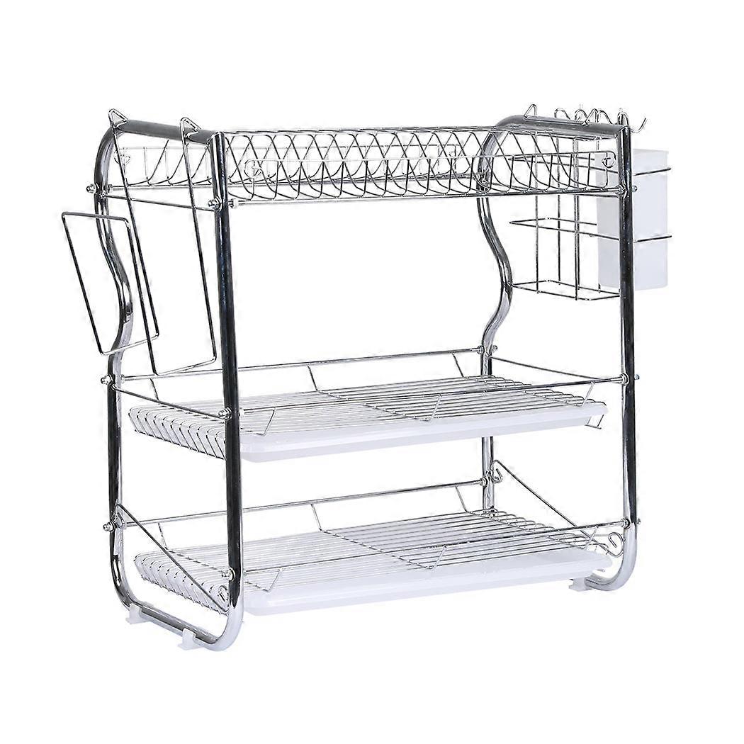 Description Our Three-Tier Dish Rack Provides A Hygienic Draining Area And Storage Space Effectively Organising Your Utensils Dishes And Cups. Made From Quality Steel For Rust Resistance And Waterproofing It Enhances Durability. The Design Allows Dishes To Be Placed Upwards To Drip Dry In A Grooved Layer Along With A Removable Drain Tray For Easy Removal Of Excess Moisture. Utensils And Chopping Boards Can Be Conveniently Stored In The Side Rack Saving Space. It Comes With Four Anti-Slip Pads To Keep It Securely In Place. This Practical Cutlery Drainer Fits Perfectly In Every Contemporary Kitchen.